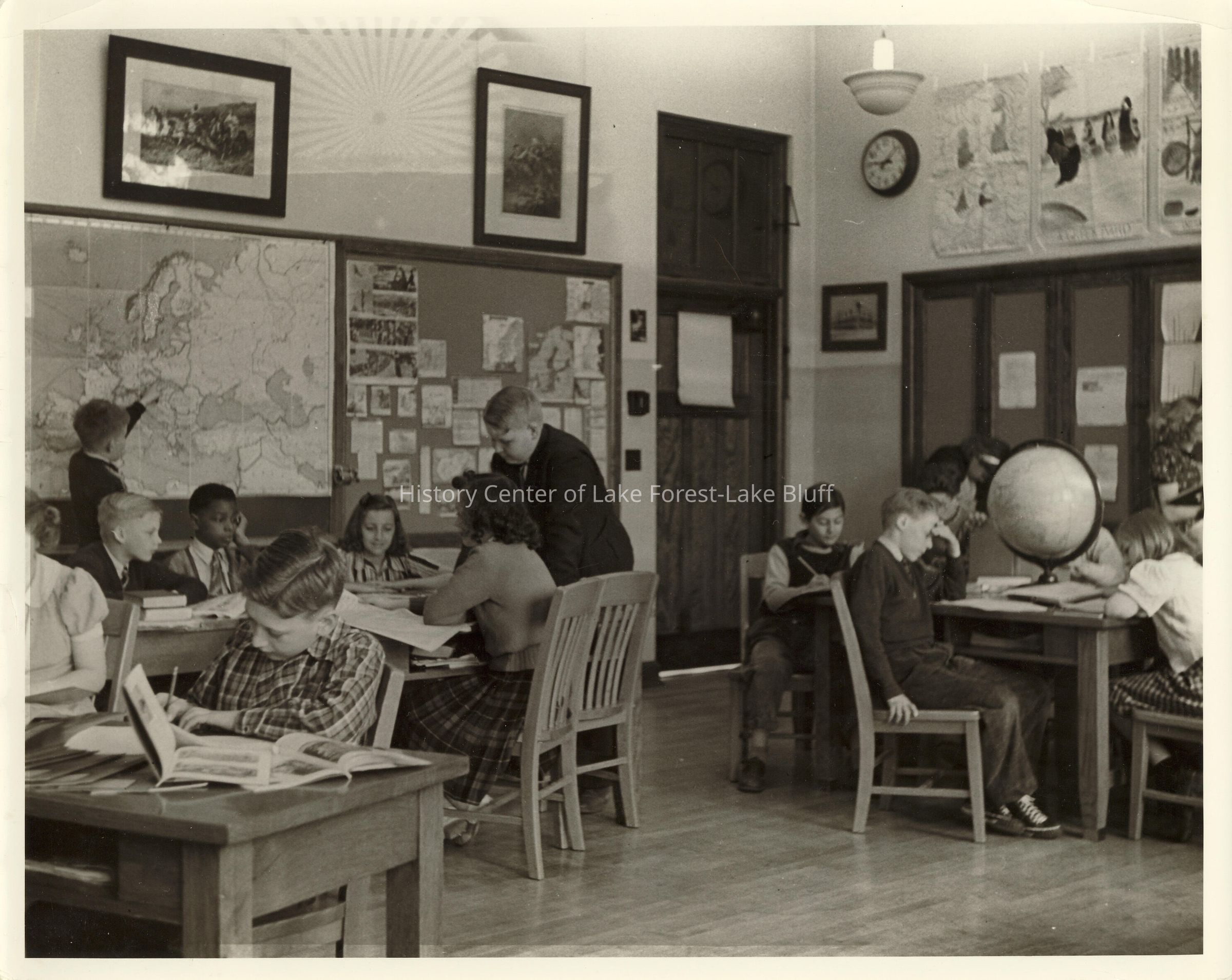 Halsey School classroom, with students at desks. Appears to be a geography or social studies class (maps on wall, globes). Taken sometime before Halsey School is torn down in 1955.