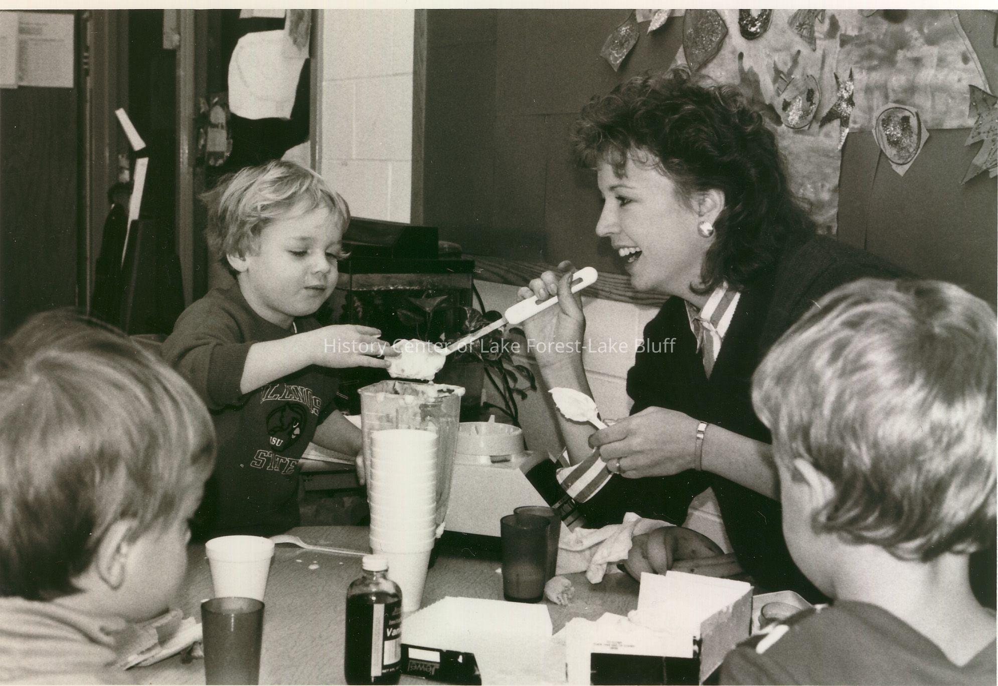 A woman and children enthusiastically make ice cream together in a classroom setting.