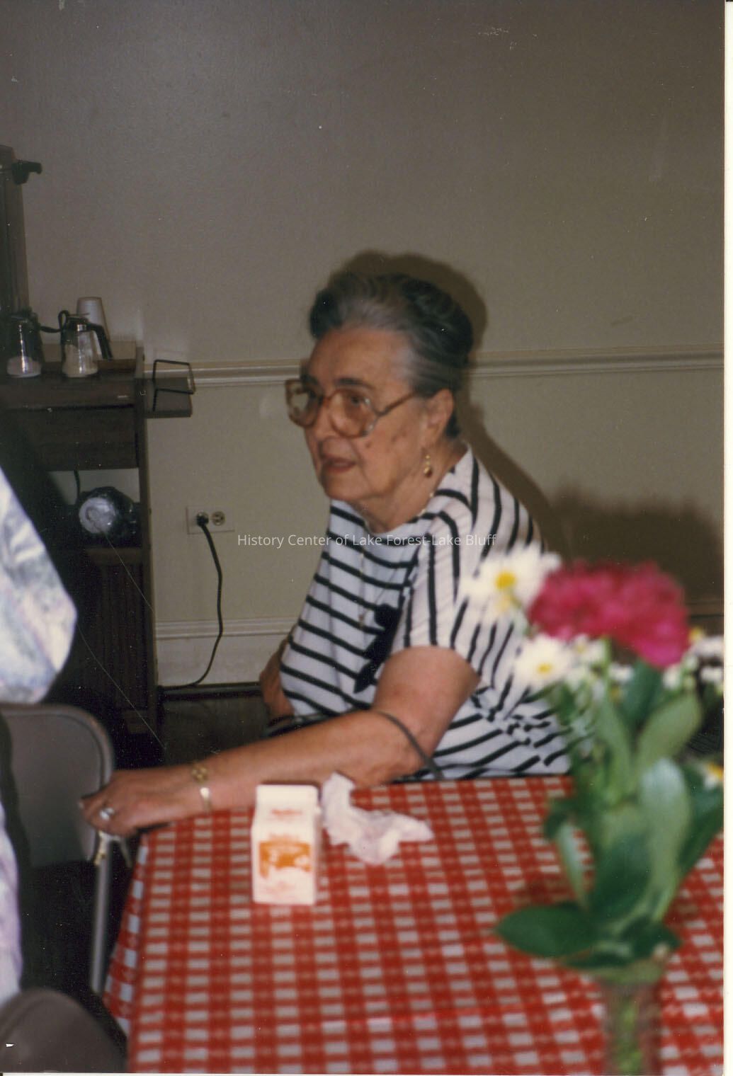 Woman with glasses, wearing black and white striped shirt, sitting at table with red and white checkered table cloth.