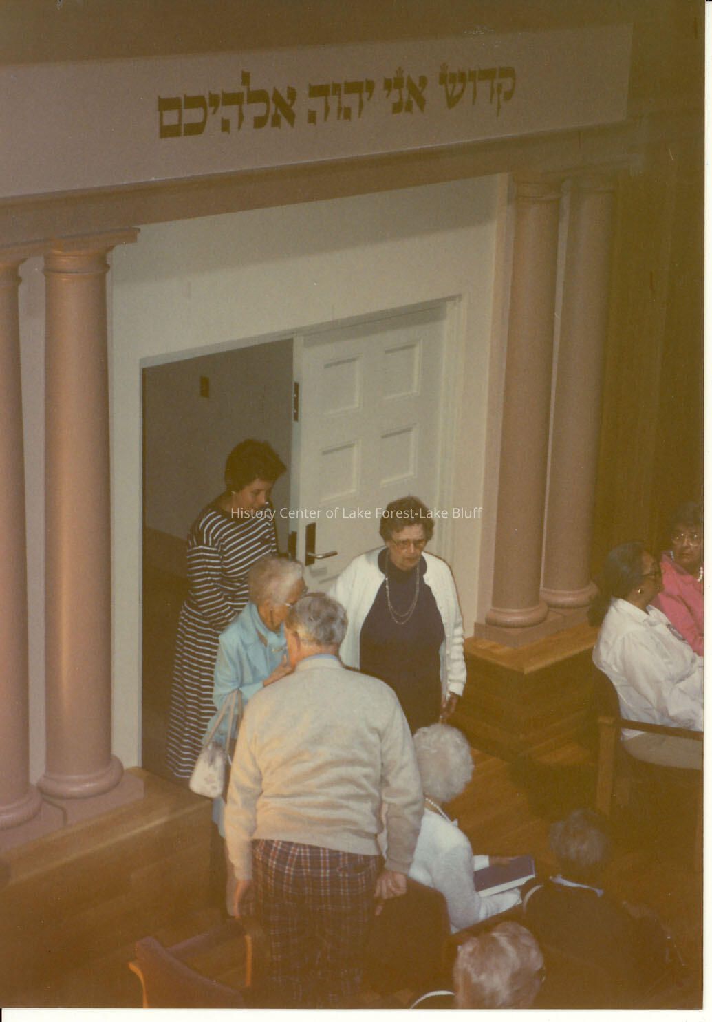 North Shore Congregation Israel, Glencoe. Ladies entering Frank Memorial hall, one wearing a blue and white striped dress, one wearing a light blue suite and one wearing a white sweater over a dark dress. Man in beige sweater is standing in the foreground.