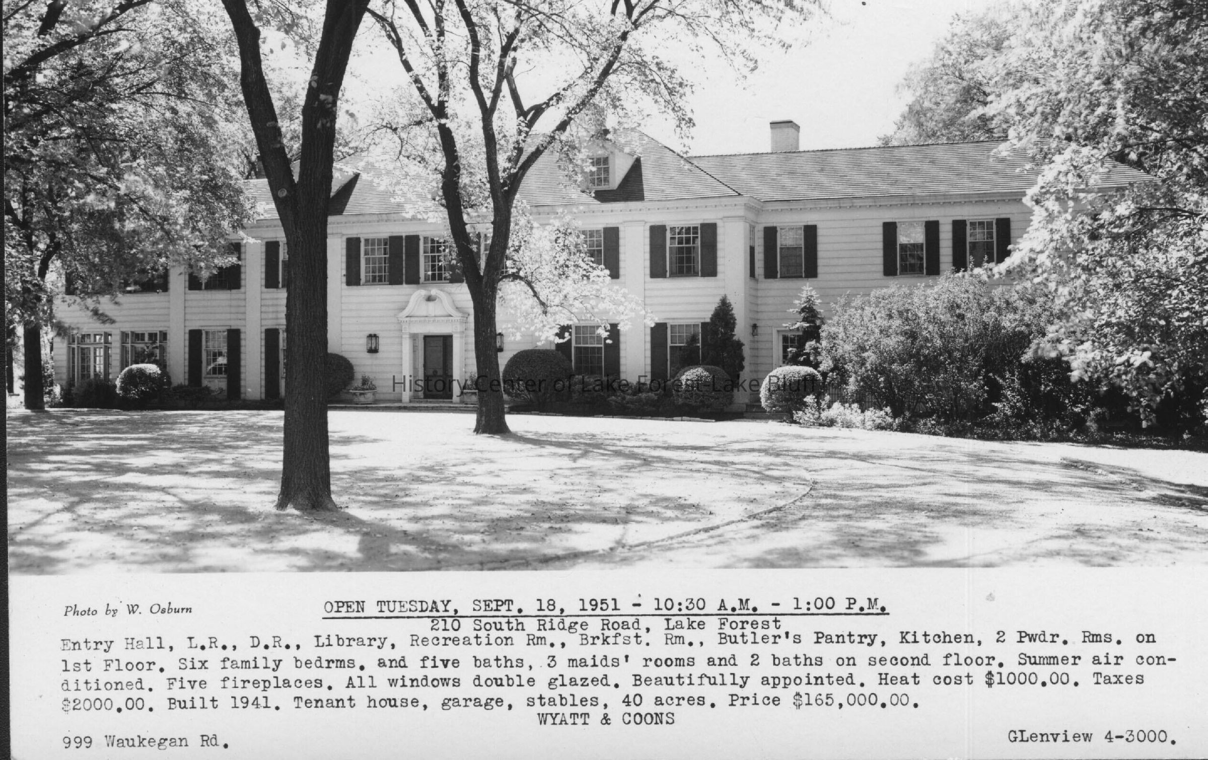 210 South Ridge Road - former Charles Garfield King estate (father of Ginevra King) postcard with real estate listing