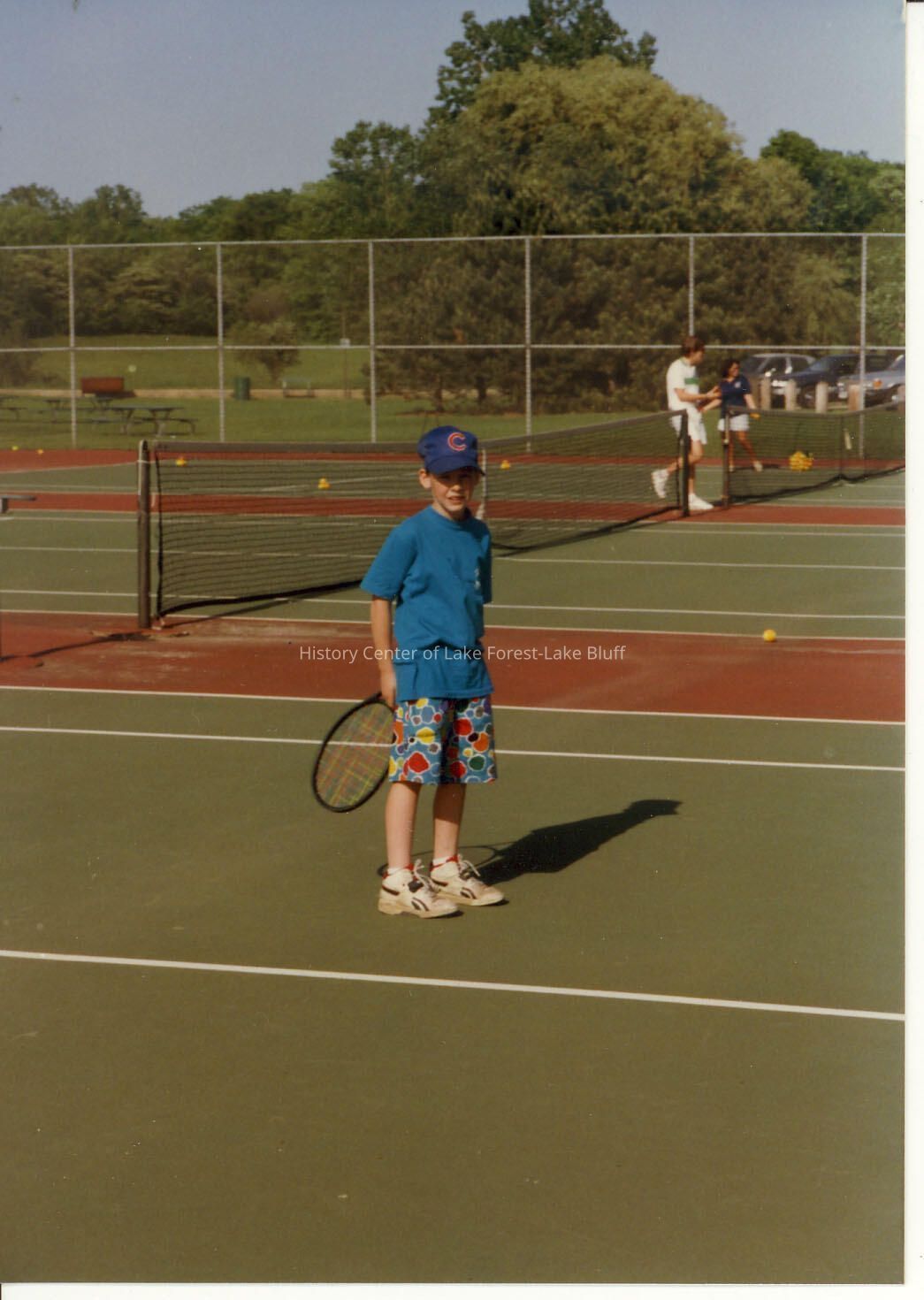 Boy on the tennis court, wearing multicolored shorts and a blue shirt, wearing a Cubs cap. Other players are visilbe in the far back