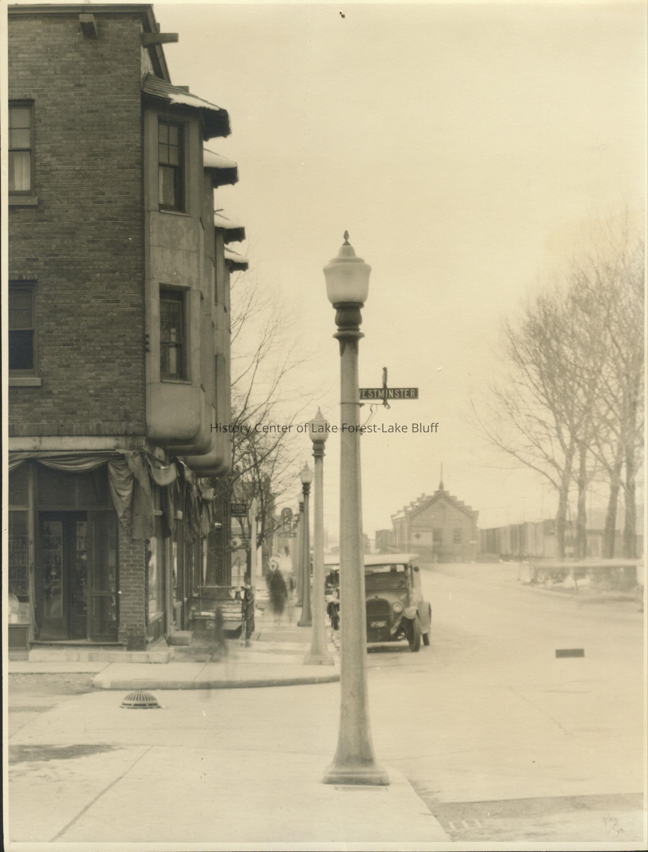 Corner of Westminster and Western Avenue looking north. Streetlight, businesses signs for gas and "Exide". to the right shows train cars and the Lake Forest Freight House. See https://en.wikipedia.org/wiki/Exide