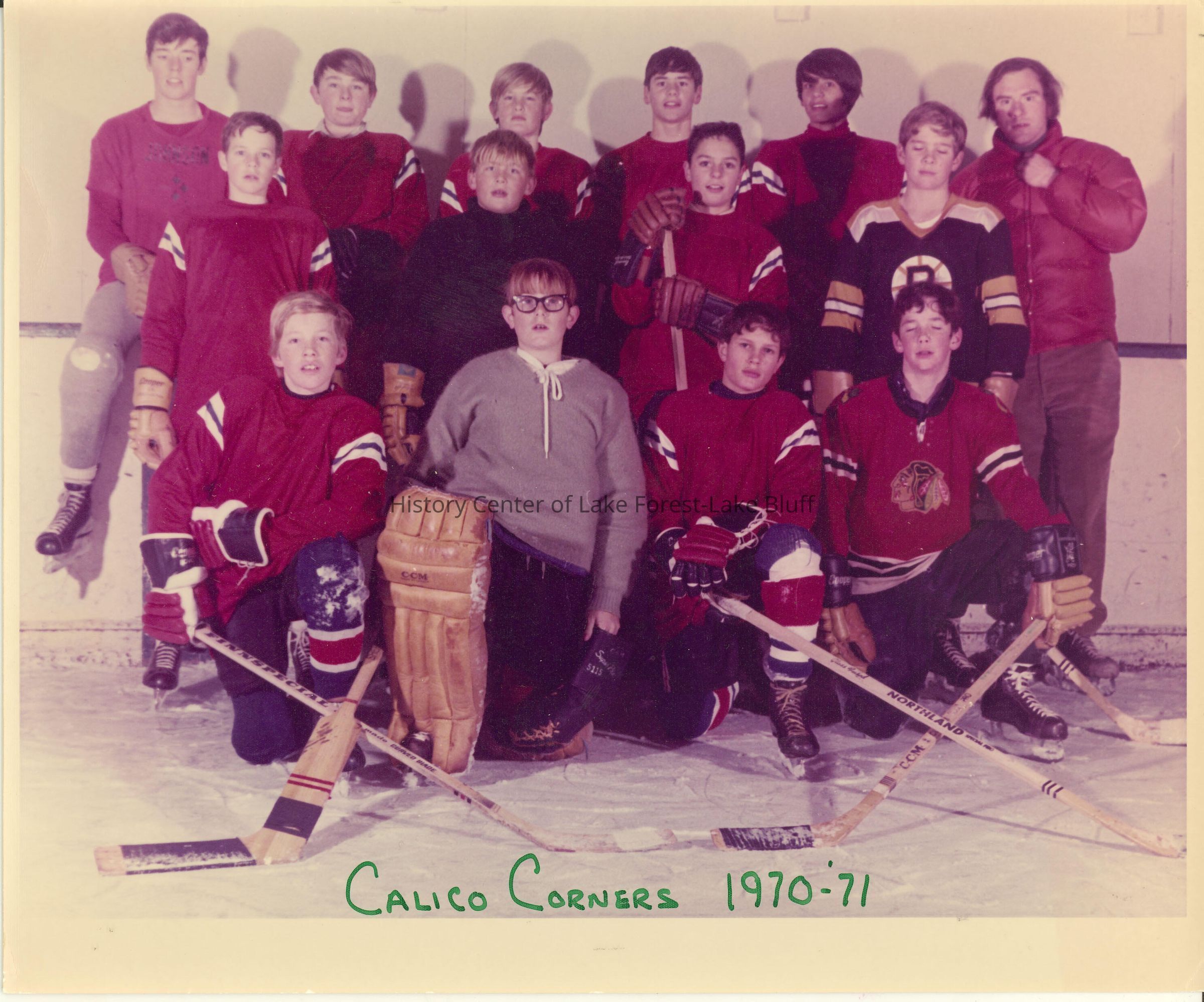 boys hockey team, thirteen players and one coach; uniforms are maroon with white and black stripes trim. Calico Corners 1970-71