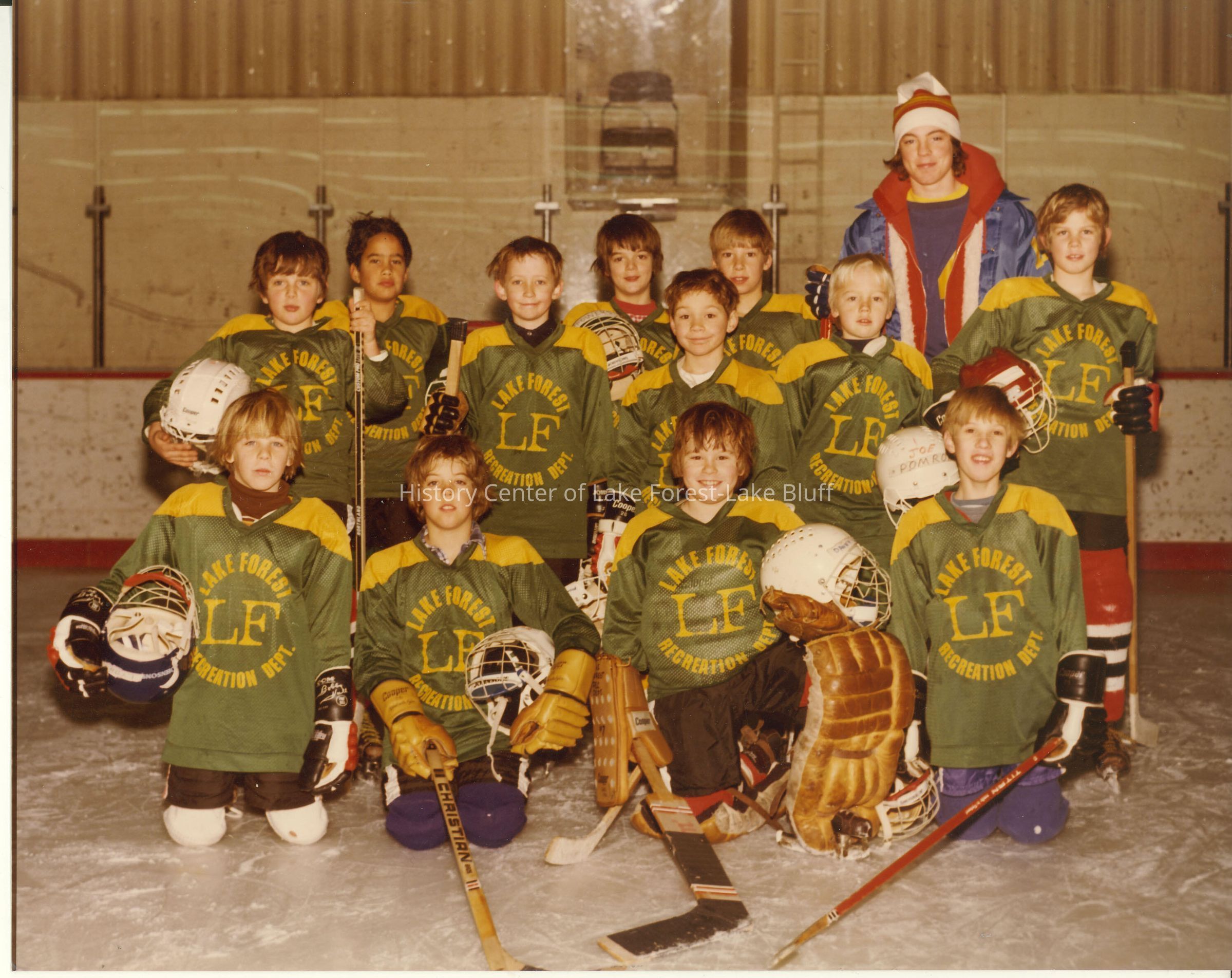 boys hockey team, twelve players, one coach. Uniforms are green and gold, with LF Rec Dept imprinted on the front.