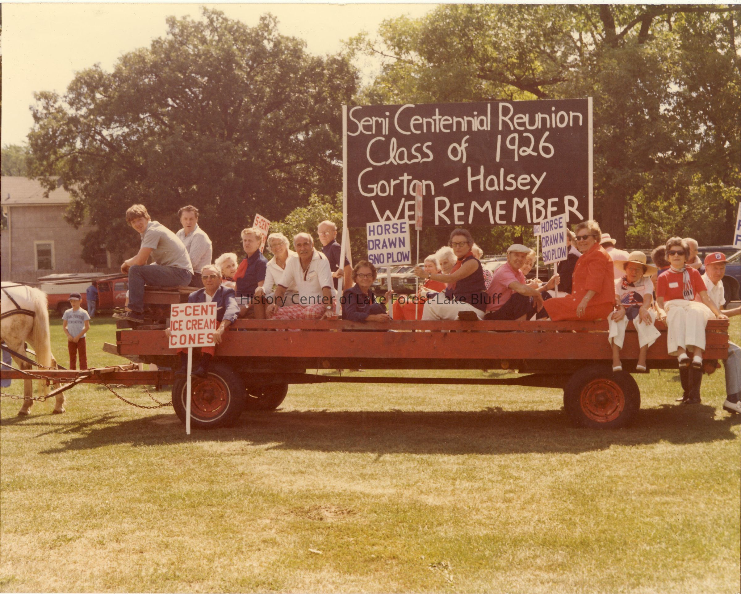 Halsey 50 year Reunion float. Large red wagon, pulled by horses. Senior Citizens on the float, holding signs, the largest sign says : "Semi Centennial Reunion Class of 1926. Gorton-Halsey. WE REMEMBER". Lake Forest Day Parade
