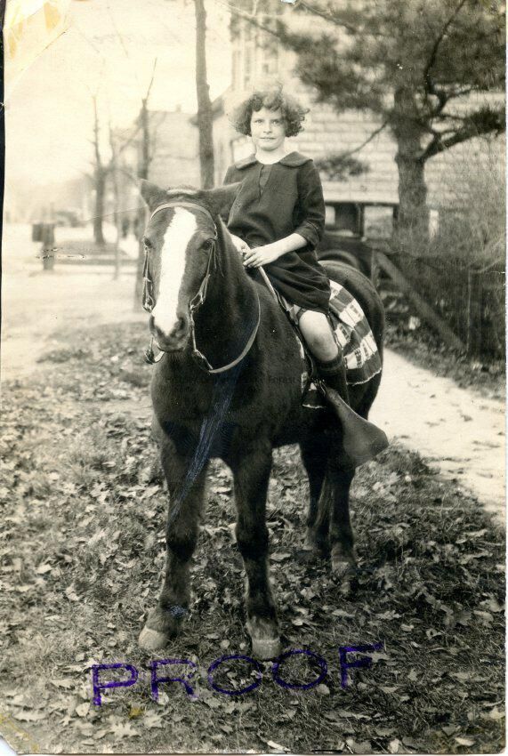 Hazel Swanton O'Neill on pony. Proof of 2018.9.32. Back is stamped with order information. Ordered by Mrs. F.E. Swanton, 1922.