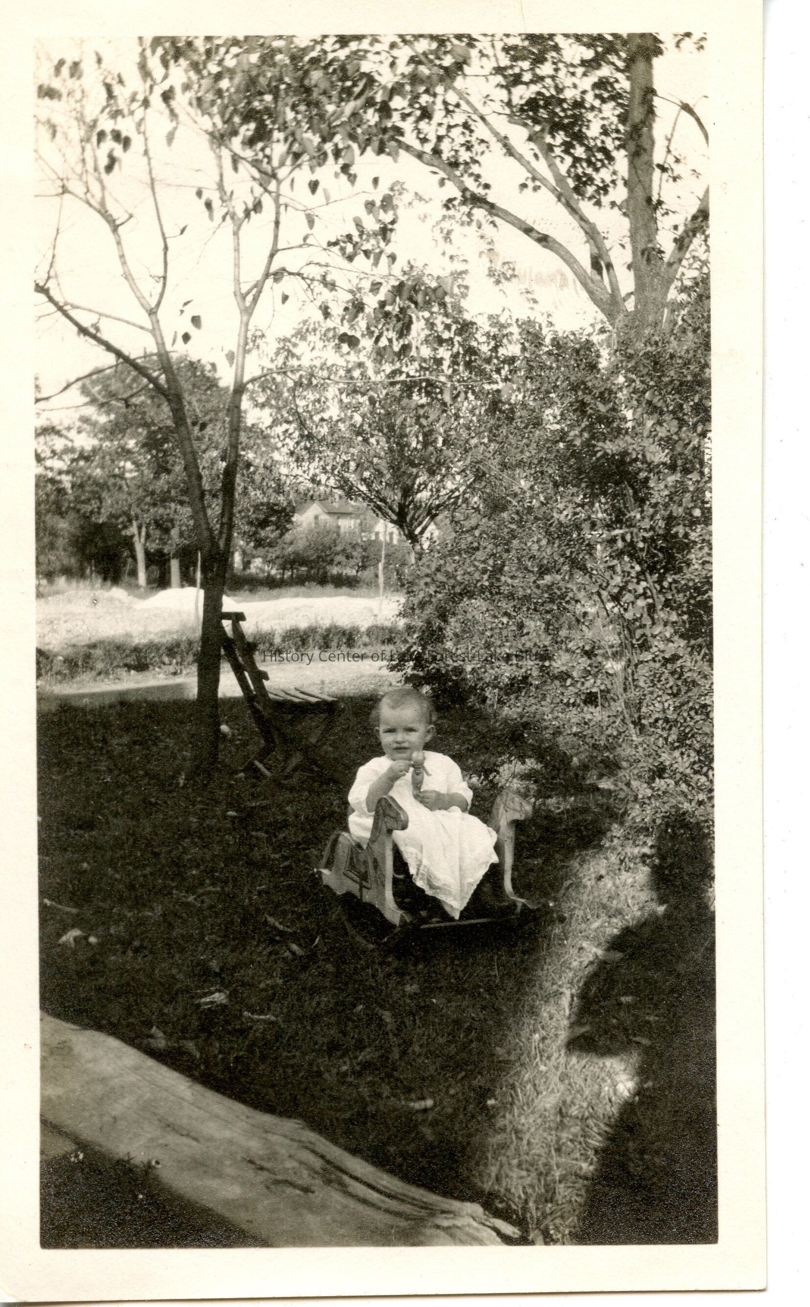 Joe O'Neill as a toddler. Sitting in rocking horse chair, holding doll.