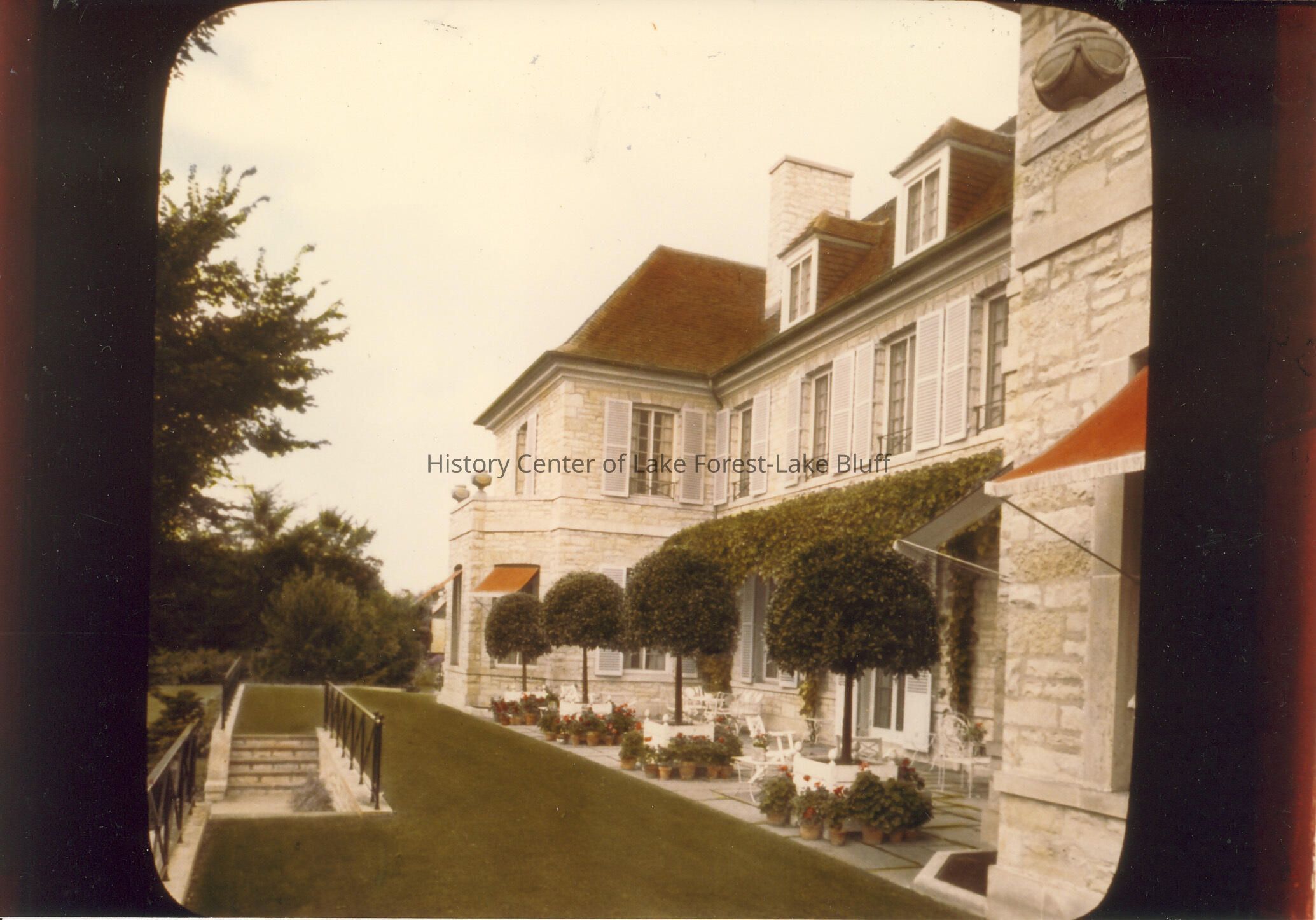 three-story light -colored stone structure with four topiary trees on patio Innsifail II 830 North Green Bay Road Joseph M. Cudahy and Jean Morton Cudahy David Adler Ferruccio Vitale 1930