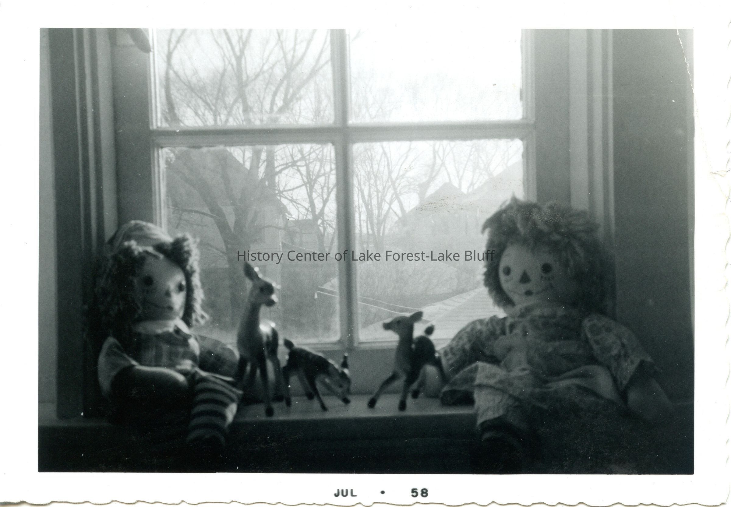 Looking out window of Jane O'Neill's bedroom at 139 Woodland Road. Raggedy Ann and Raggedy Andy dolls perched in window with deer figurines. July 1958.