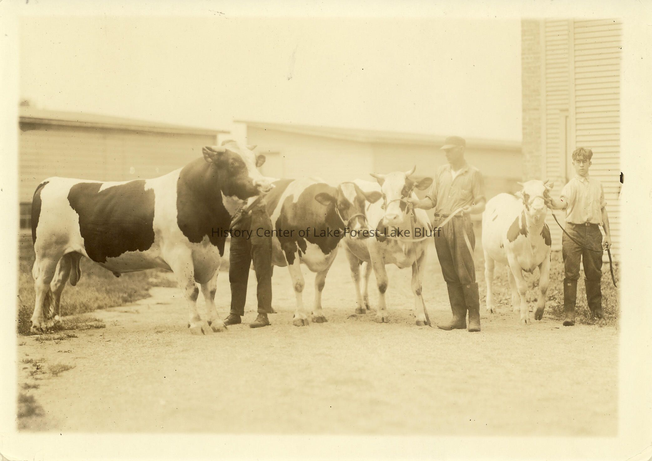 Four bulls and 3 unidentified men at side of building at Old Mill Farm