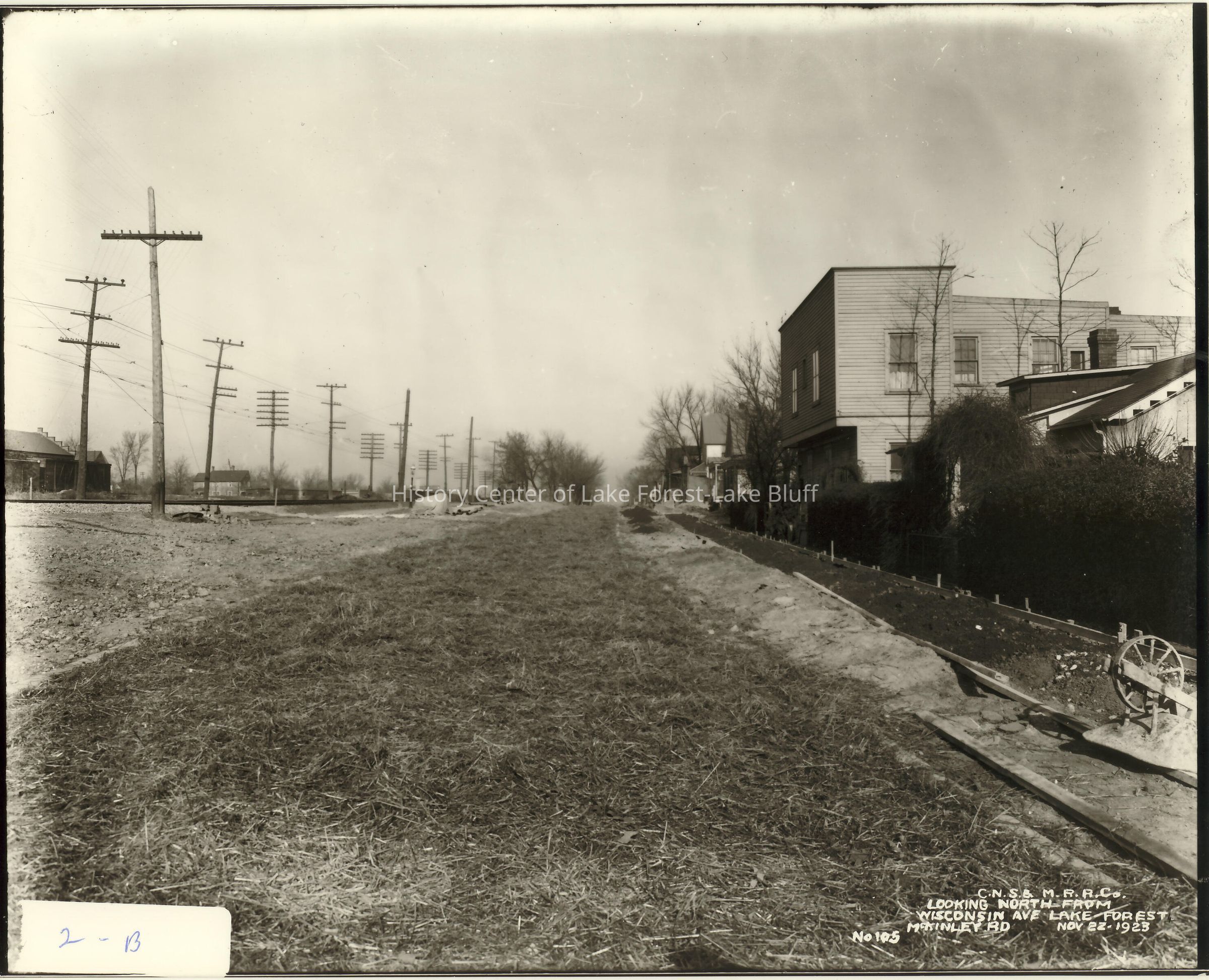 Lake Forest McKinley Road Rebuilding in 1923 re North Shore Line C.N.S. & M.R.R.C. looking north from Wisconsin Avenue McKinley Road November 22, 1923
