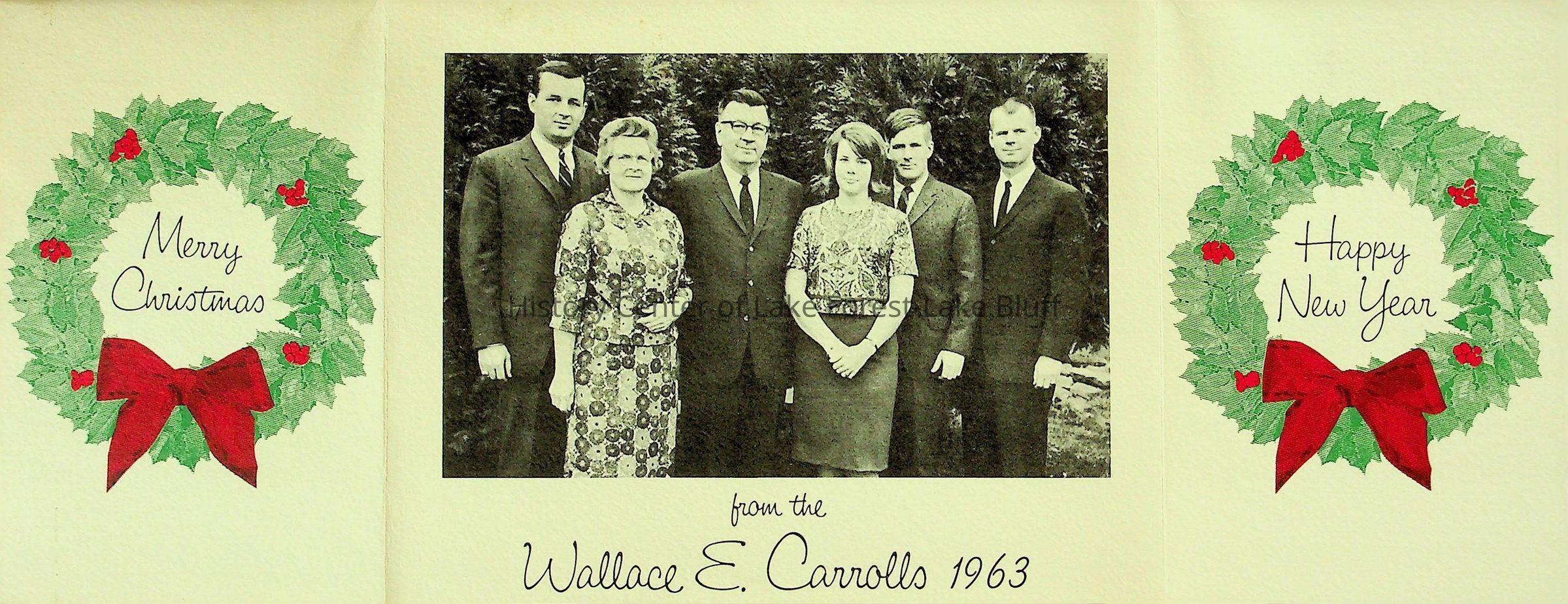 White cardstock paper folded in half lengthwise and then folded to make two opening flaps. Front of the card features a stamped image of brick posts and gates. Card opens to show printed black and white photograph which is bordered by text which reads "Merry Christmas" and "Happy New Years", respectively. Each text is encircled by a wreath.