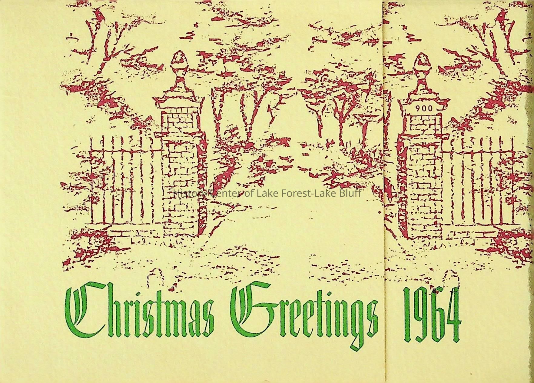 Off-white cardstock paper folded three-fourths of the way over itself, with stamped image of brick posts and gates covering the top fold and continuing on to the revelaed lower fold.. Card opens to show two printed black and white photographs with part of the stamped image serving as a background. This is the first card which features Patrick Carroll's wife, Mimi.
