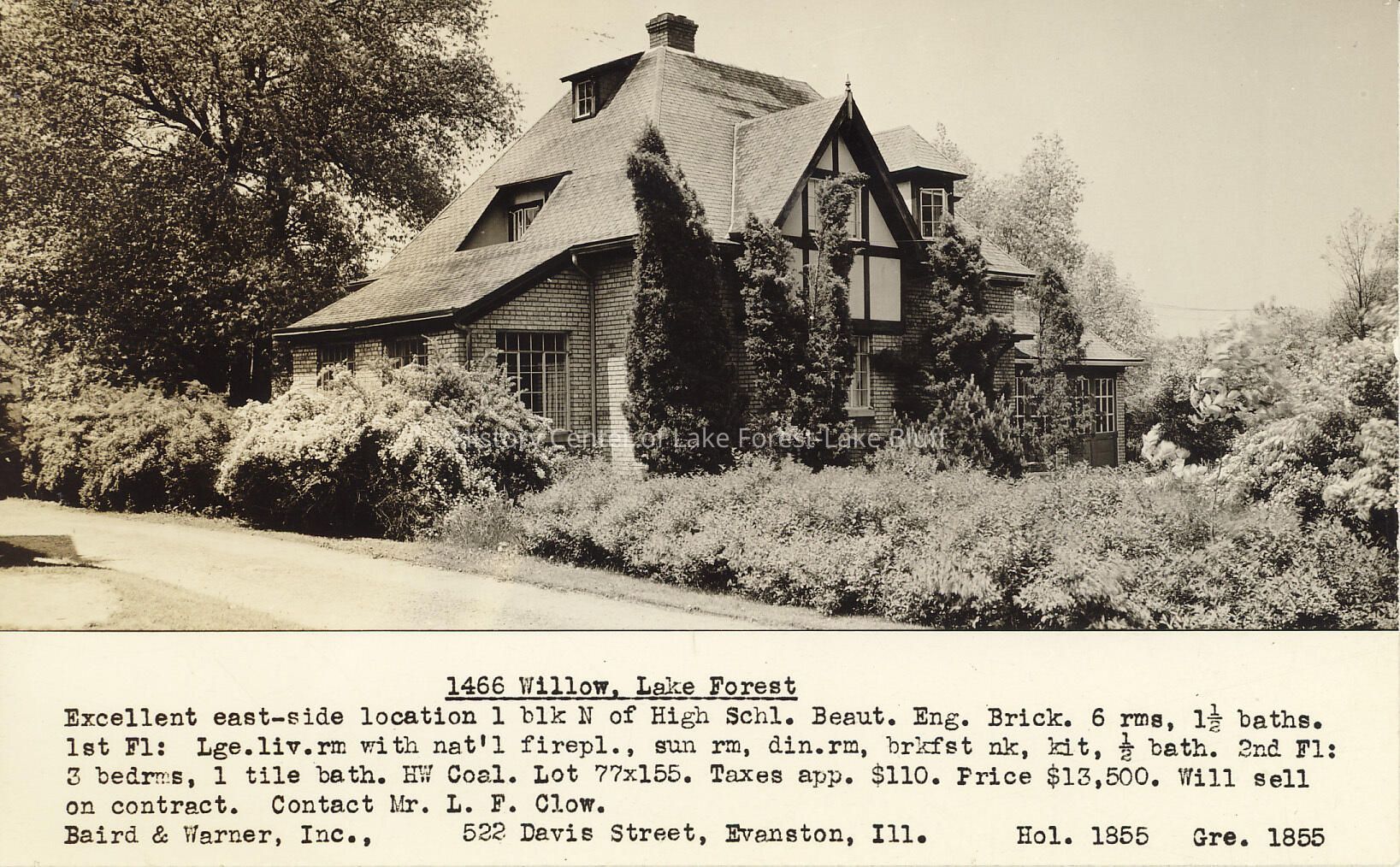Three-story English brick residence surrounded by dense shrubbery and evergreen trees real estate listing postcard