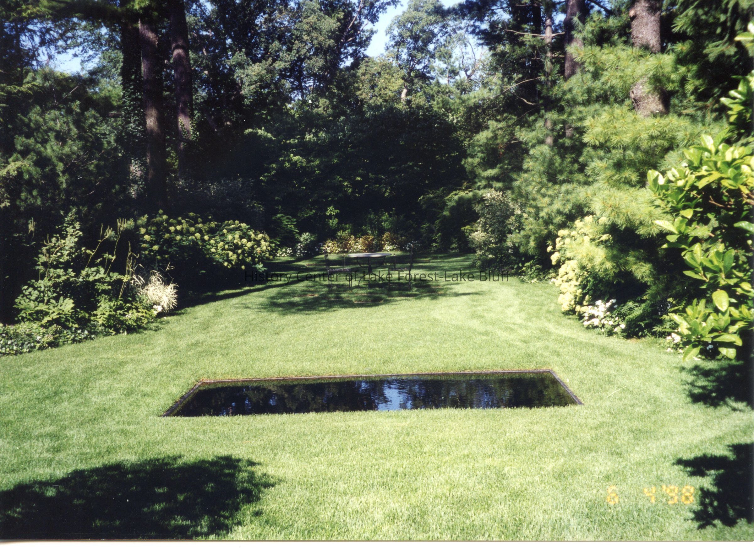 Color photograph of Posy Krehbiel's Garden at 930 E. Rosemary - Camp Rosemary. Date stamped June 4, 1998. Reflecting pool.