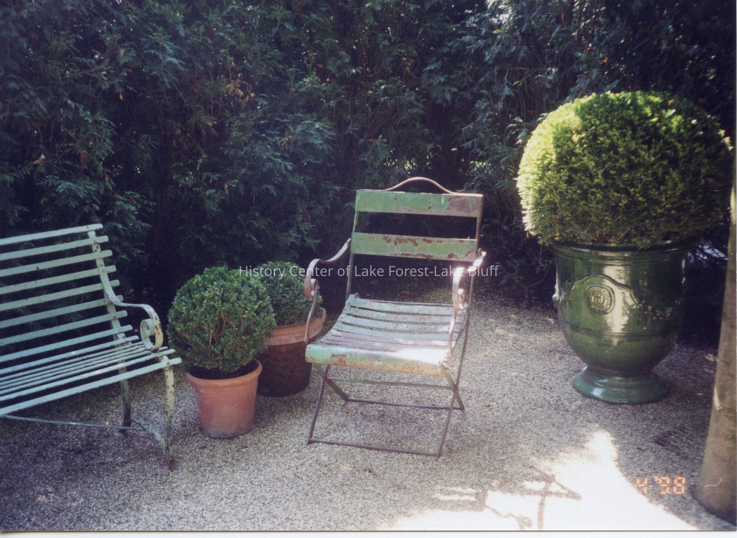Color photograph of Posy Krehbiel's Garden at 930 E. Rosemary - Camp Rosemary. Date stamped June 4, 1998. Sitting area with bench and chair.