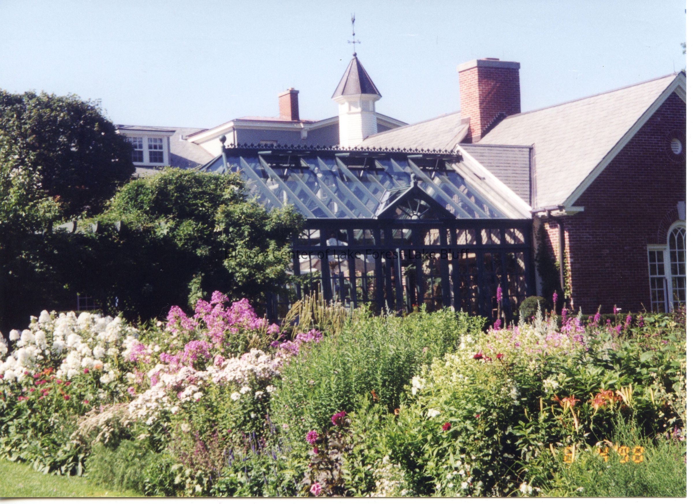 Color photograph of Posy Krehbiel's Garden at 930 E. Rosemary - Camp Rosemary. Date stamped June 4, 1998. Shows rear of house and greenhouse or conservatory. NE corner of house.