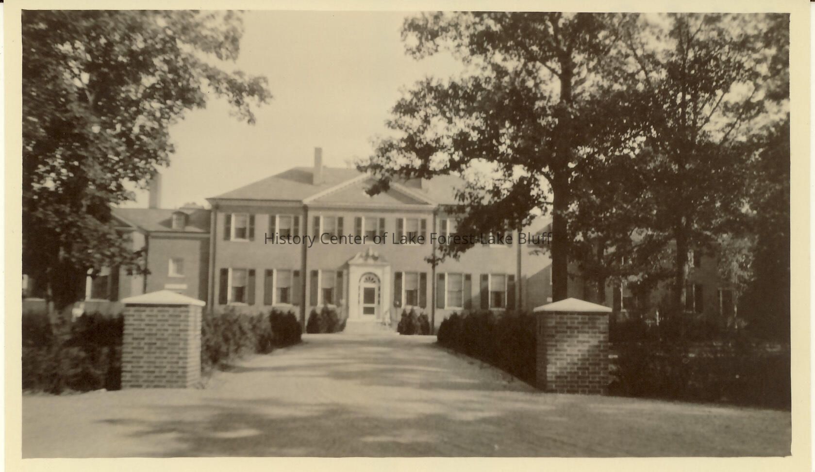 Robert and Grace Farwell McGann house - Fairlawn (965 E. Deerpath) Two-story brick residence with view of front entrance. There are short brick pillars and shrubs flanking the center driveway.