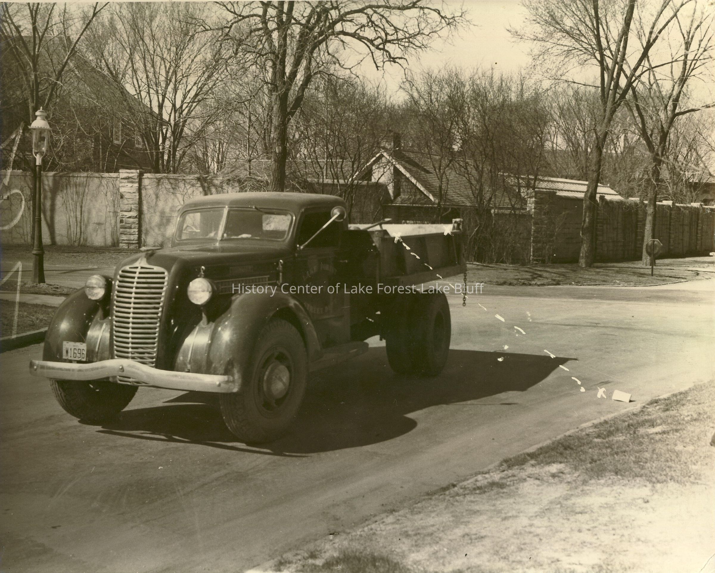Intersection of Laurel Avenue and Green Bay Road looking southwest. A truck labeled Lake Forest Street Dept is driving through the intersection. Similar view to 2005.66.121.