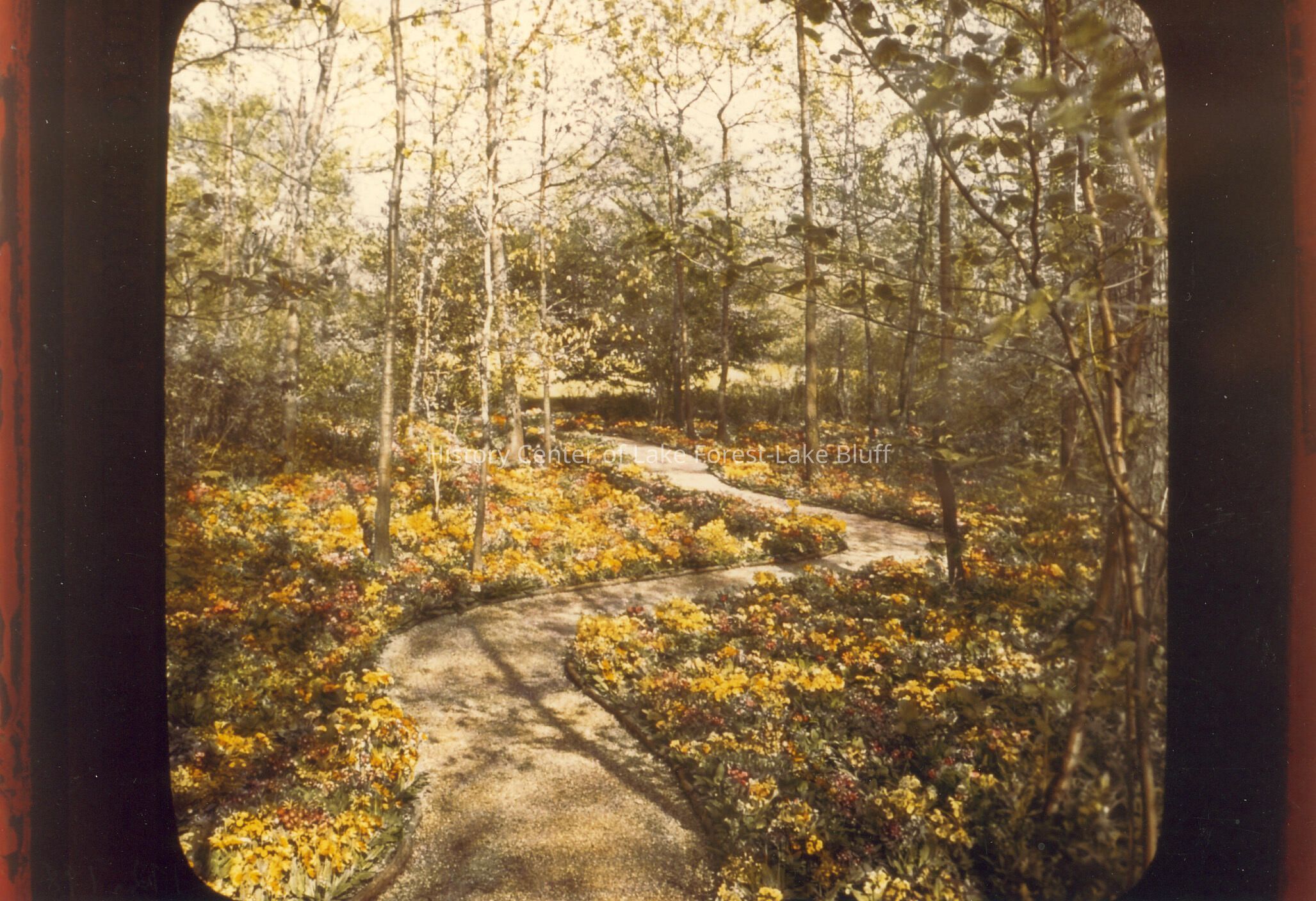 Color photograph of curving gravel path with primroses following its length