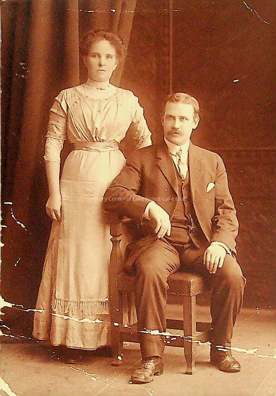 Loose photograph of James and Helen Dow in Chicago from the early 20th century. The James is seated in a three piece suit, while Helen stands beside him, dressed in an Edwardian day dress. There are signs of retouching around her waist.