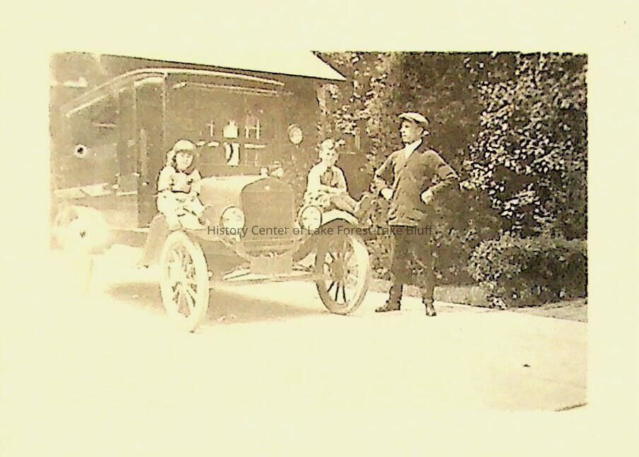 Small photograph of James "Jim" Dinley and two children, Thomas and Florence, seated on the front of a car. Back of photograph reads "Jim, Thomas & Florence, July 1919"