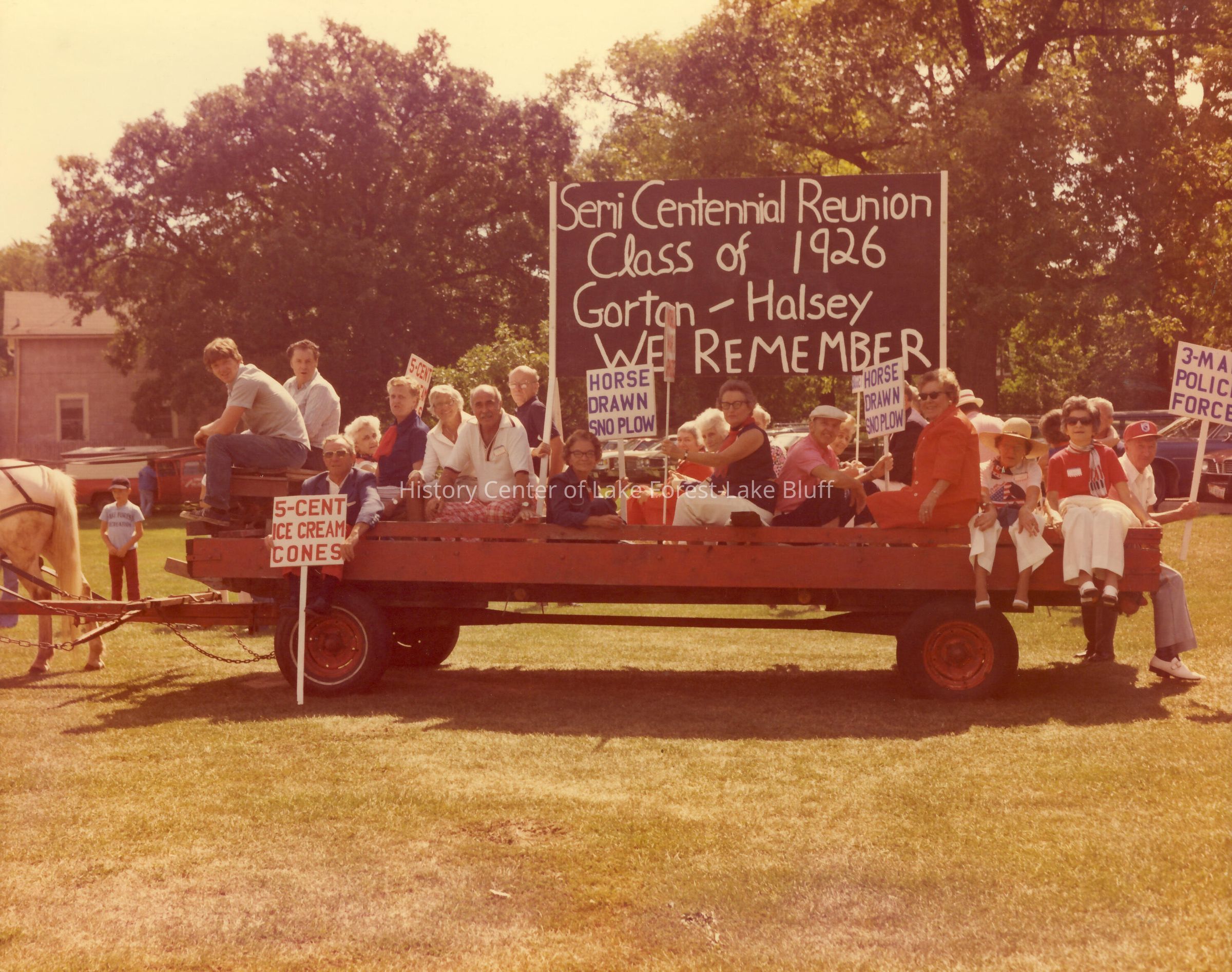 Color photograph of the Semi Centennial Reunion of Gorton-Halsey Class of 1926 August, 1976. Parade card with a large black sign with white letters "Semi Centennial Reunion Class of 1926 Gorton-Halsey We Remember." Red cart being pulled by two white horses in the parade. Several alumni are seated on the cart holding signs.