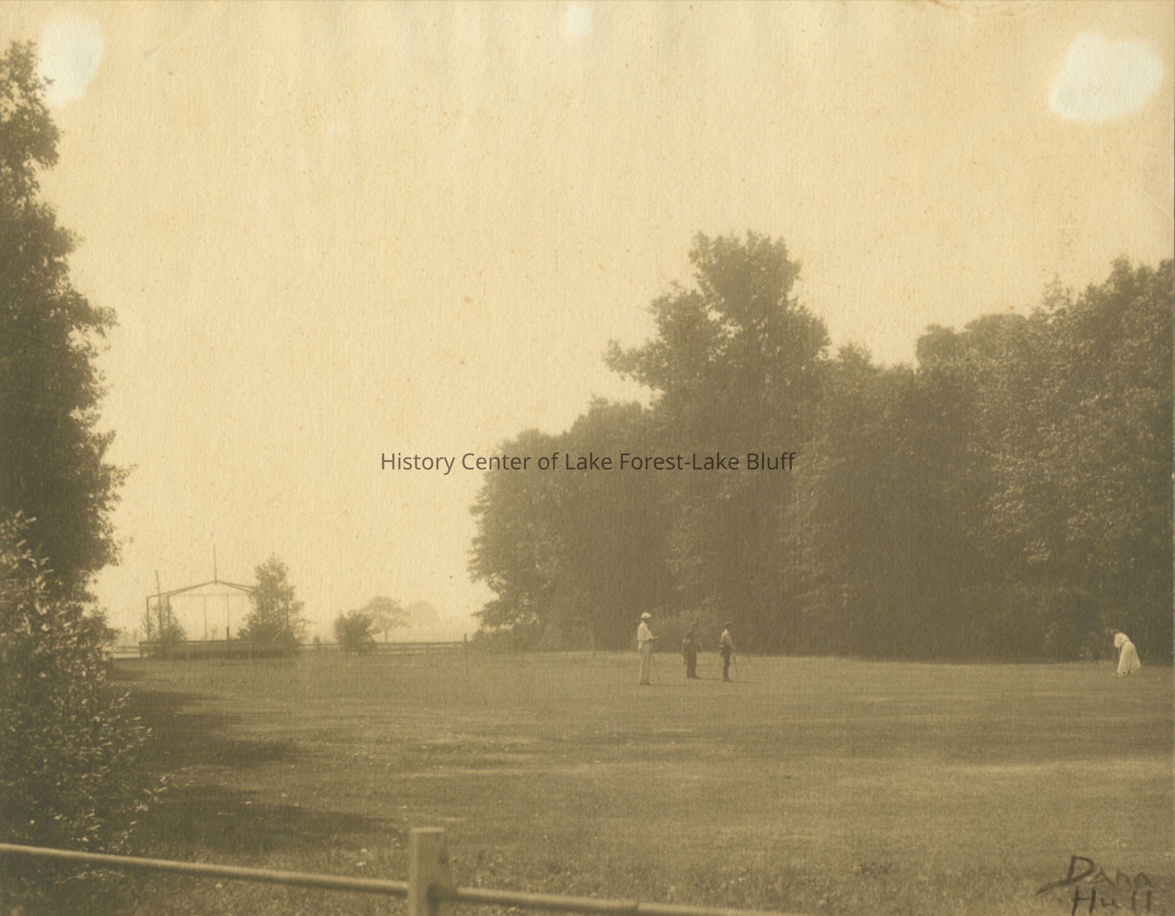 Sepia toned photograph at Onwentsia Club of golfers- possibly Julia Thompson. name written on photo Dana Hull