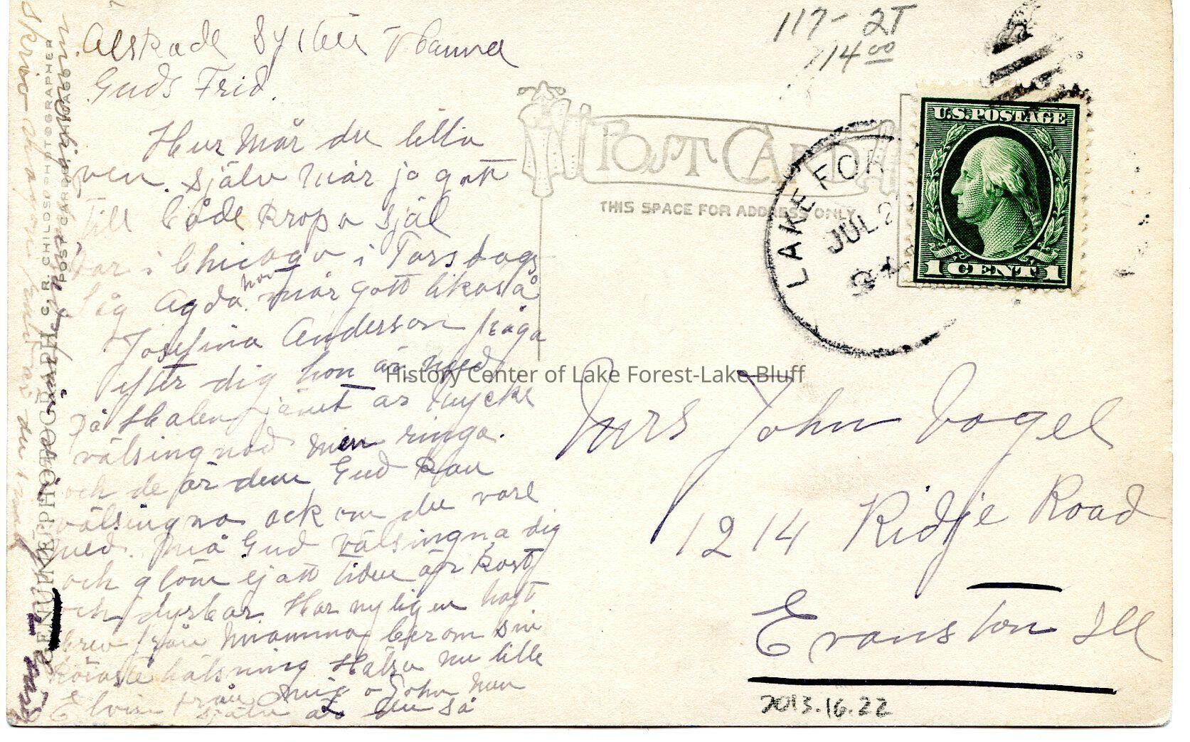 Reverse is address to Mrs. John Vogel of Evanston. Letter is written in a Scandinavian language.Lexicon