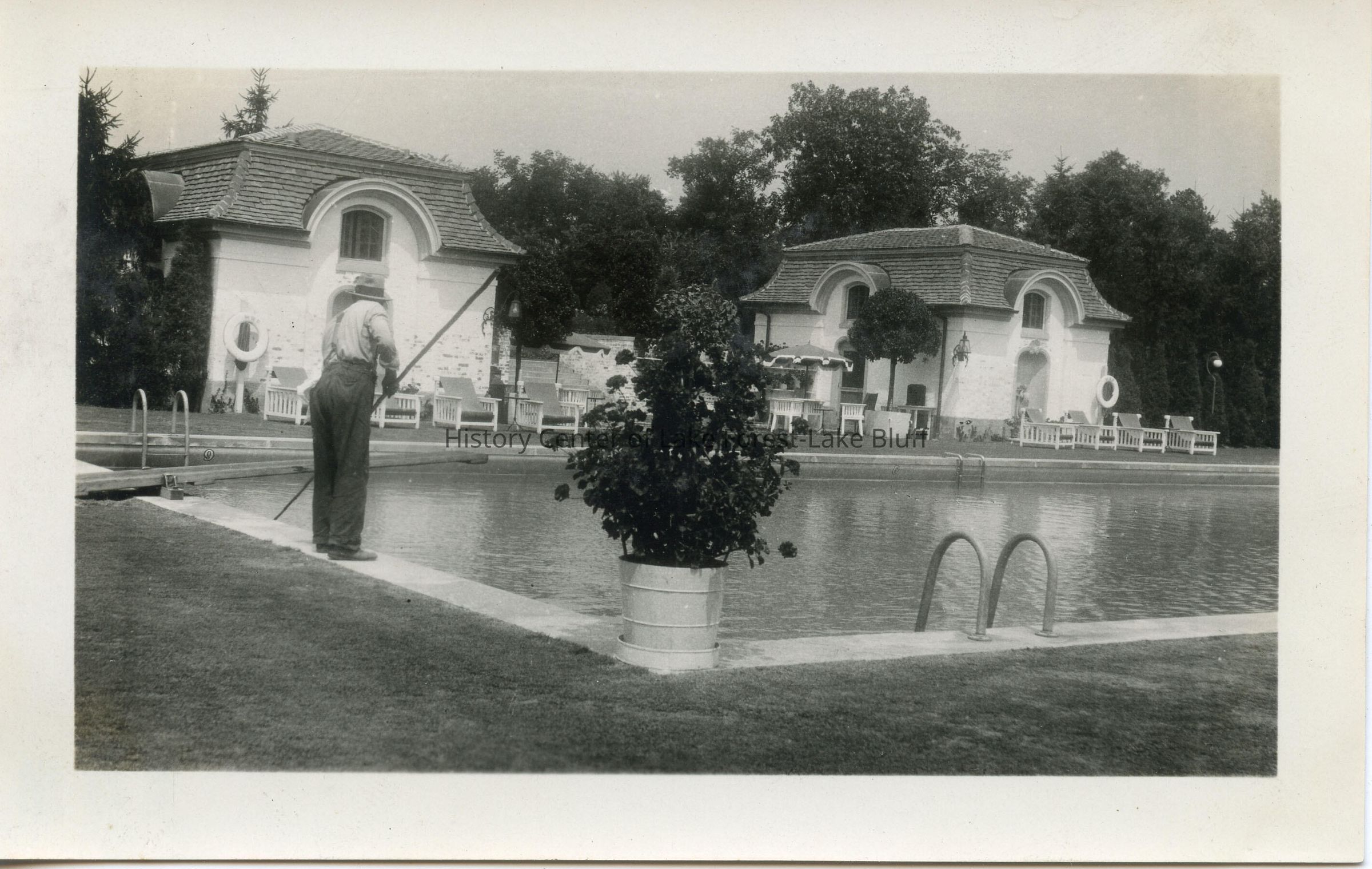 A.D. Lasker Estate swimming pool, Mill Road Farm, 1352 West Estate Lane. Black and white photograph of pool, pool houses, man cleaning pool.
