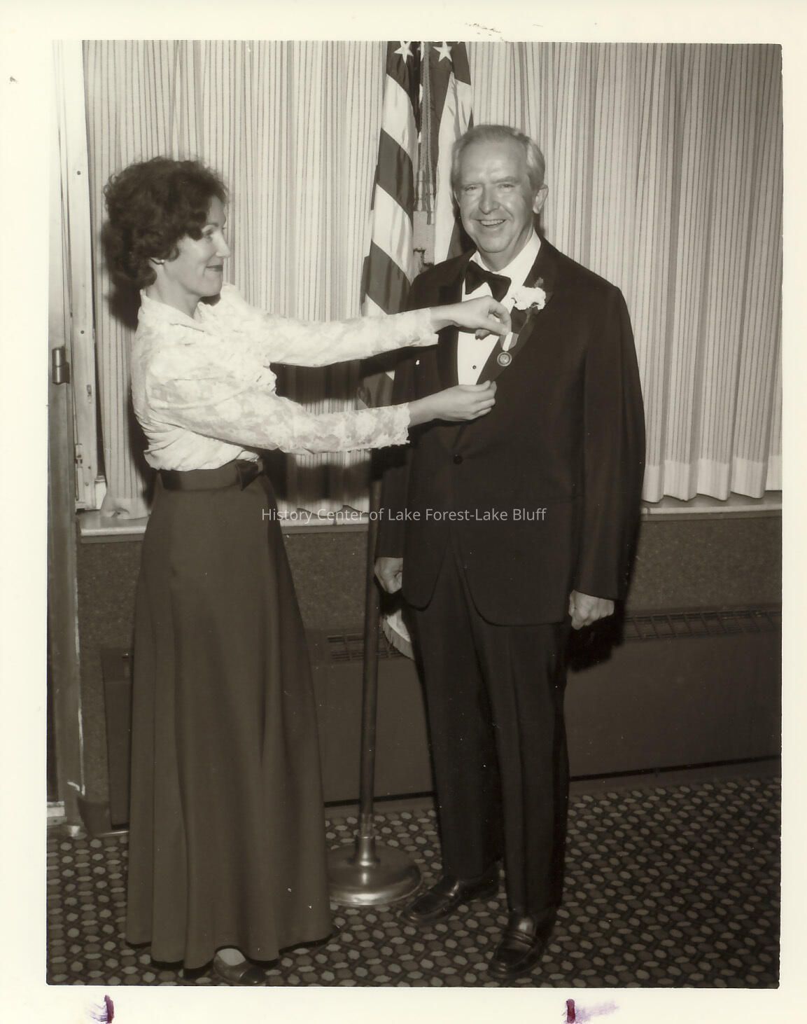Unidentified woman presenting a medal to Gene Mullin, standing in front of a flag. Mr. Mullin taught at Lake Forest High School