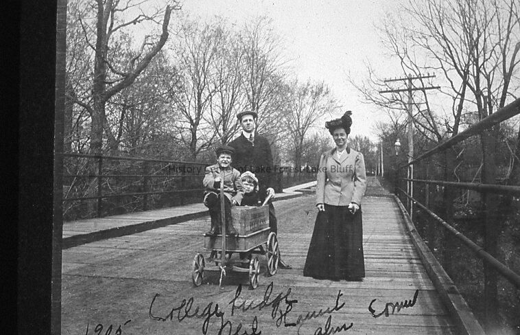 Unidentified family - children in a wagon on a bridge 1010 East Spring Lane - outbuilding Fairlawn II 965 East Deerpath, built 1923 owners: Robert and Grace Farwell Winston McGann architects: Delano & Aldrich also called Spring Lane Bridge End to College Campus
