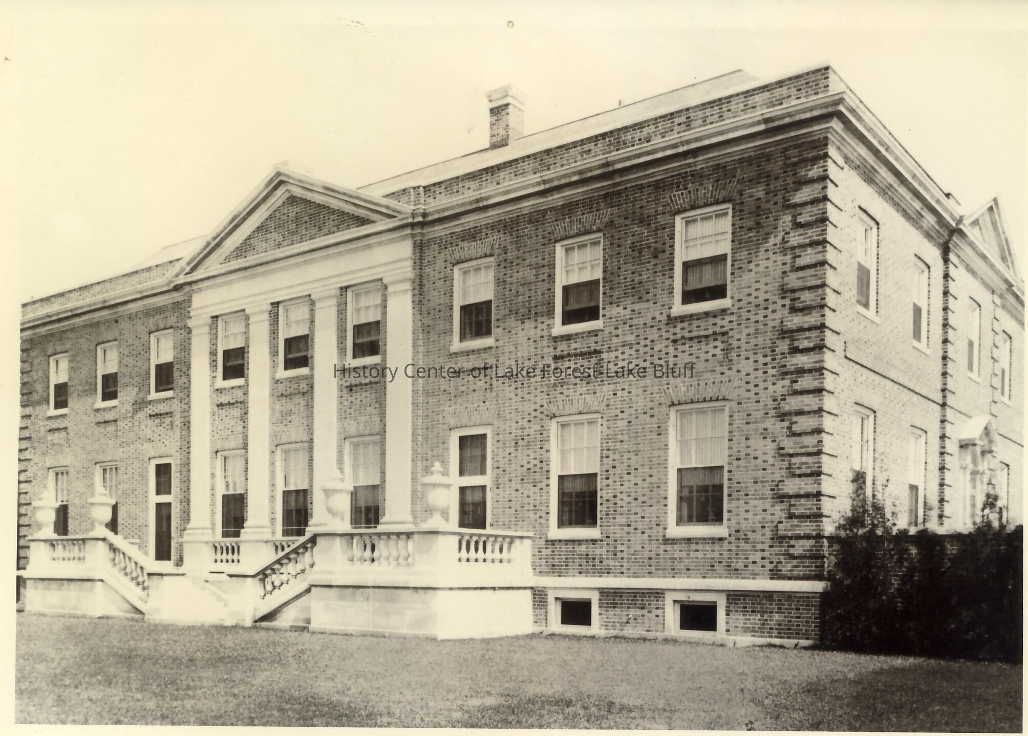 Two-story brick structure with four pillars at center and stone staircases at either side of entrance Building 29 North Chicago VA Medical Center Dewey House designed by David Adler ?