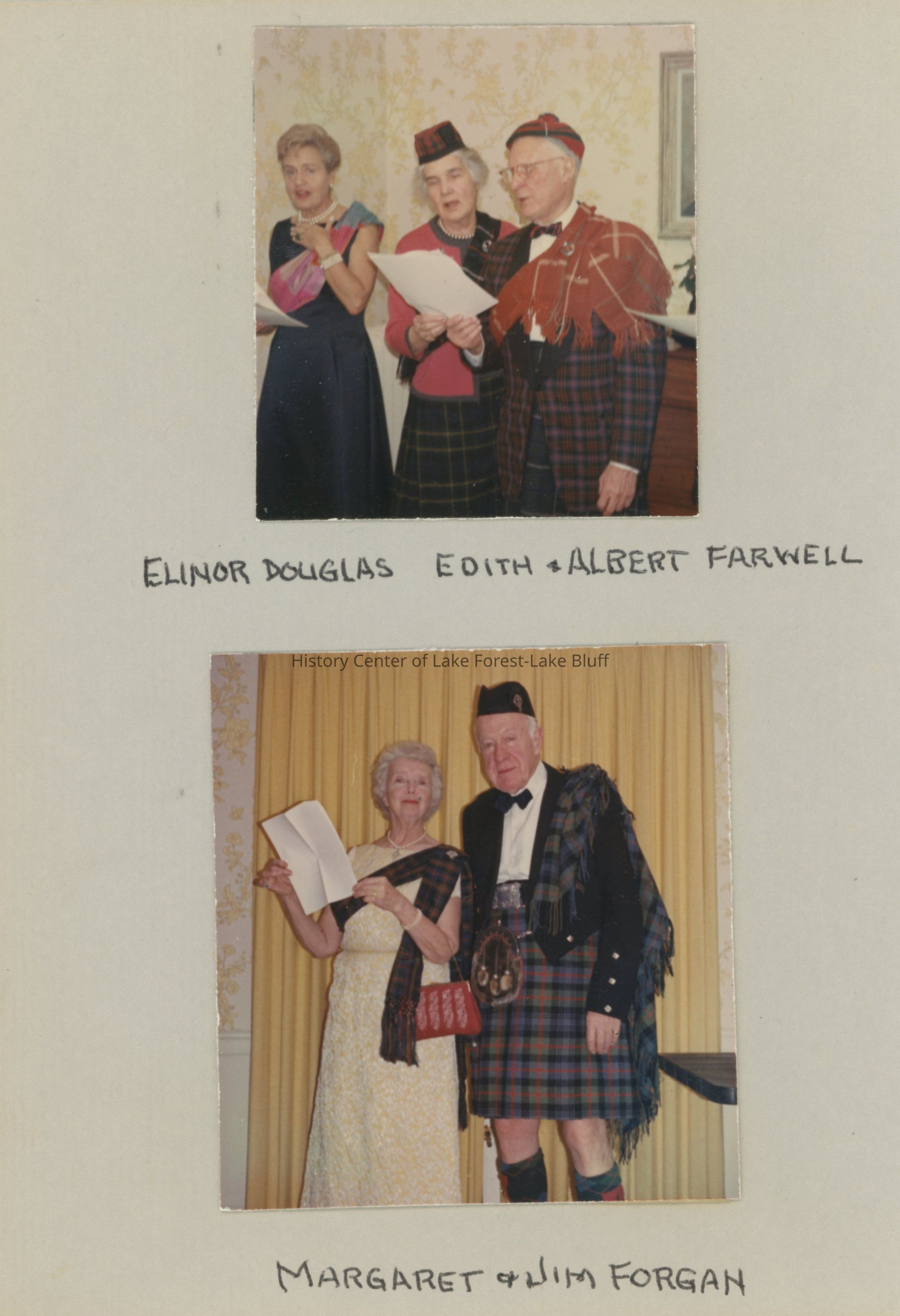 First photo is labeled "Elinor Douglas - Edith + Albert Farwell". The second photo is labeled "Margaret + Jim Forgan". Third photo is labeled "Douglas Stuart's 80th Birthday"