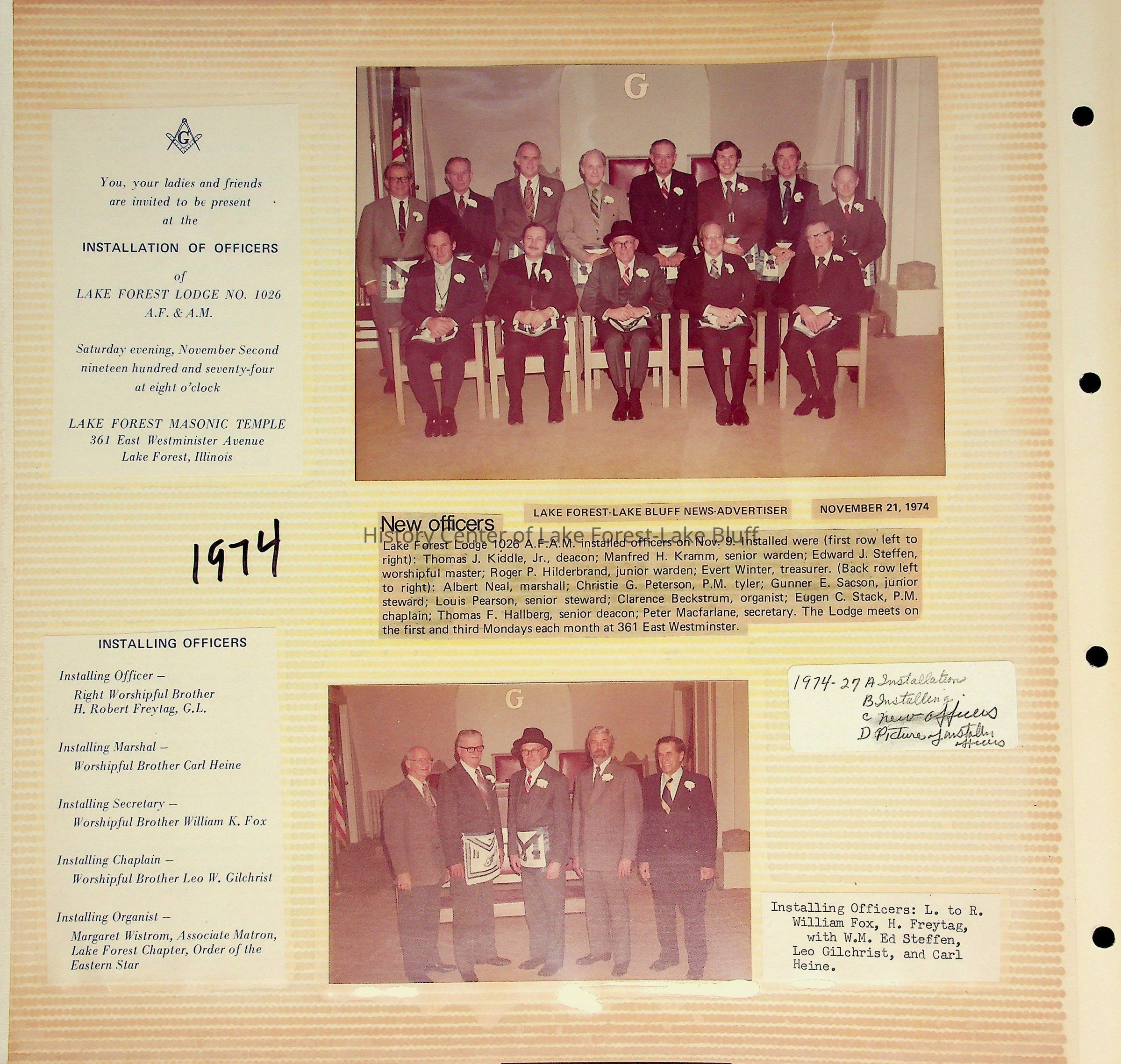 D: A photograph of the Installing Officers. Left to right: William Fox (Installing Secretary), H. Robert Freytag (Installing Officer), Edward J. Steffen (Worshipful Master), Leo W. Gilchrist (Installing Chaplain), and Carl Heine (Installing Marshal). Not pictured: Margaret Wistrom (Installing Organist).