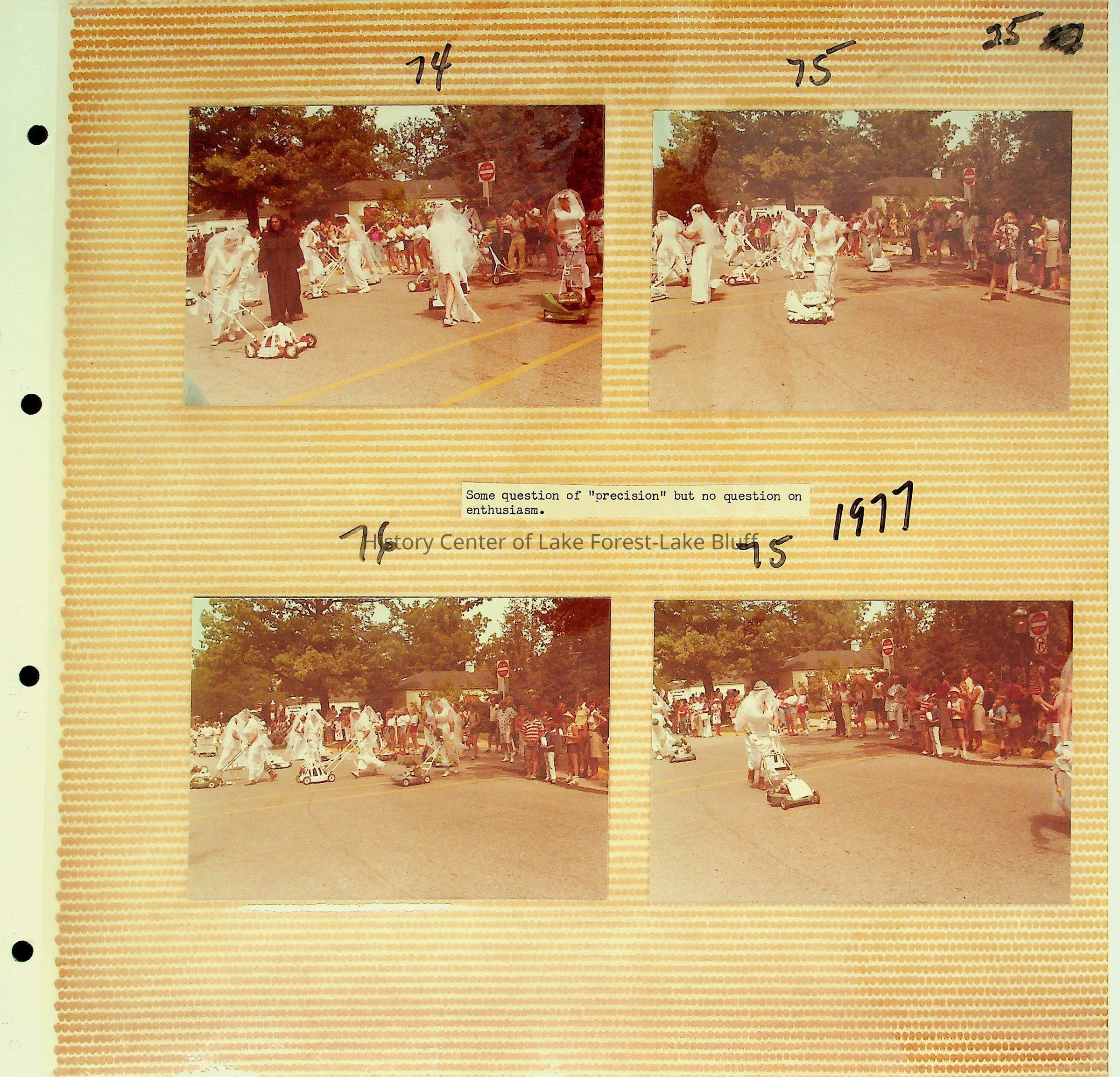 74-77: More photographs of the Lake Bluff Precision Mowers performing in the 1977 4th of July Parade.