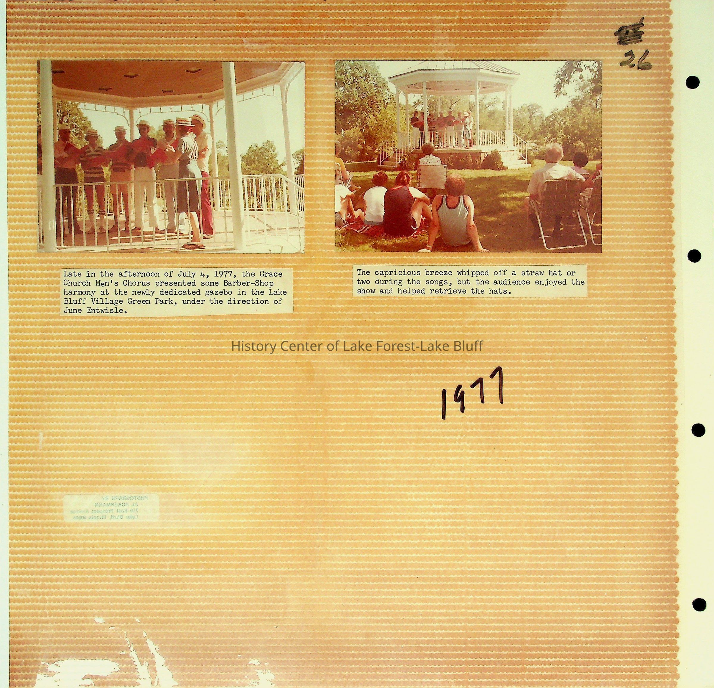 78: The Grace Church Men's Chorus presenting some barber shop harmony at the newly dedicated gazebo on the Village Green, with June Entwistle directing.