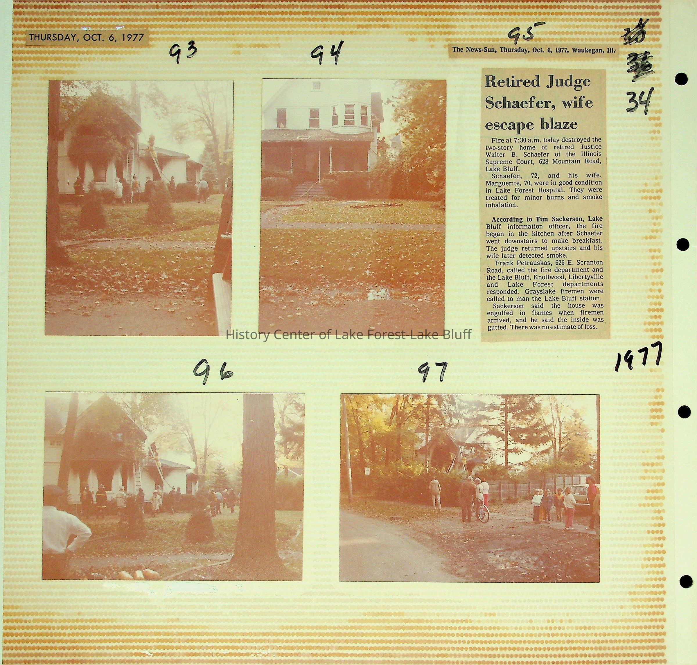 93-97: Photographs of and a newspaper clipping about a fire in the house of retired Illinois Supreme Court Justice Walter B. Schaefer (628 Mountain Road).