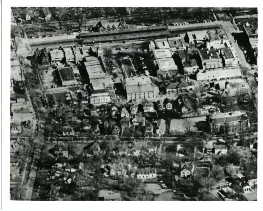 Undated black and white photograph. Aerial shot of downtown Lake Forest - Oakwood Avenue east to Western Avenue, Westminster south to Deerpath. Market Square, City Hall, Halsey School, Chicago and North Western Train Station, and the Police and Fire Station are all visible.