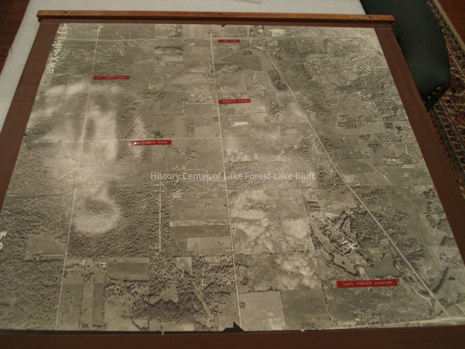 Aerial photograph showing southwest Lake Forest, dated October 23, 1954. Mounted to slats of wood - possibly used as exhibits in a meeting. Some areas are labeled in red, including Rockland Road (Route 176), St. Mary's Road, Old School Road, Bradley Road, Lake Forest AcademyLexicon