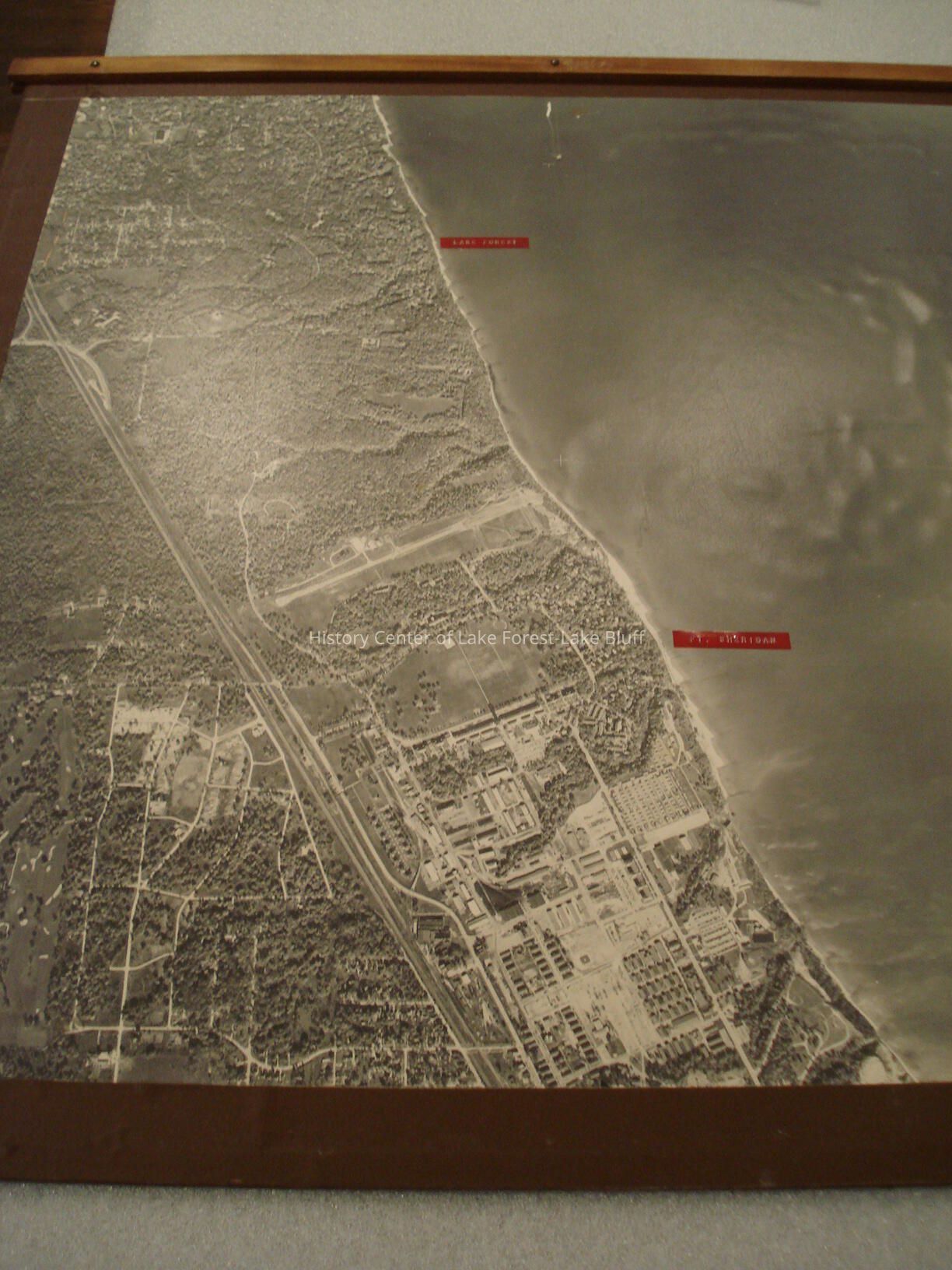 Aerial photograph showing Lake Forest and Fort Sheridan, dated October 23, 1954. Mounted to slats of wood - possibly used as exhibits in a meeting. Some areas are labeled in red.