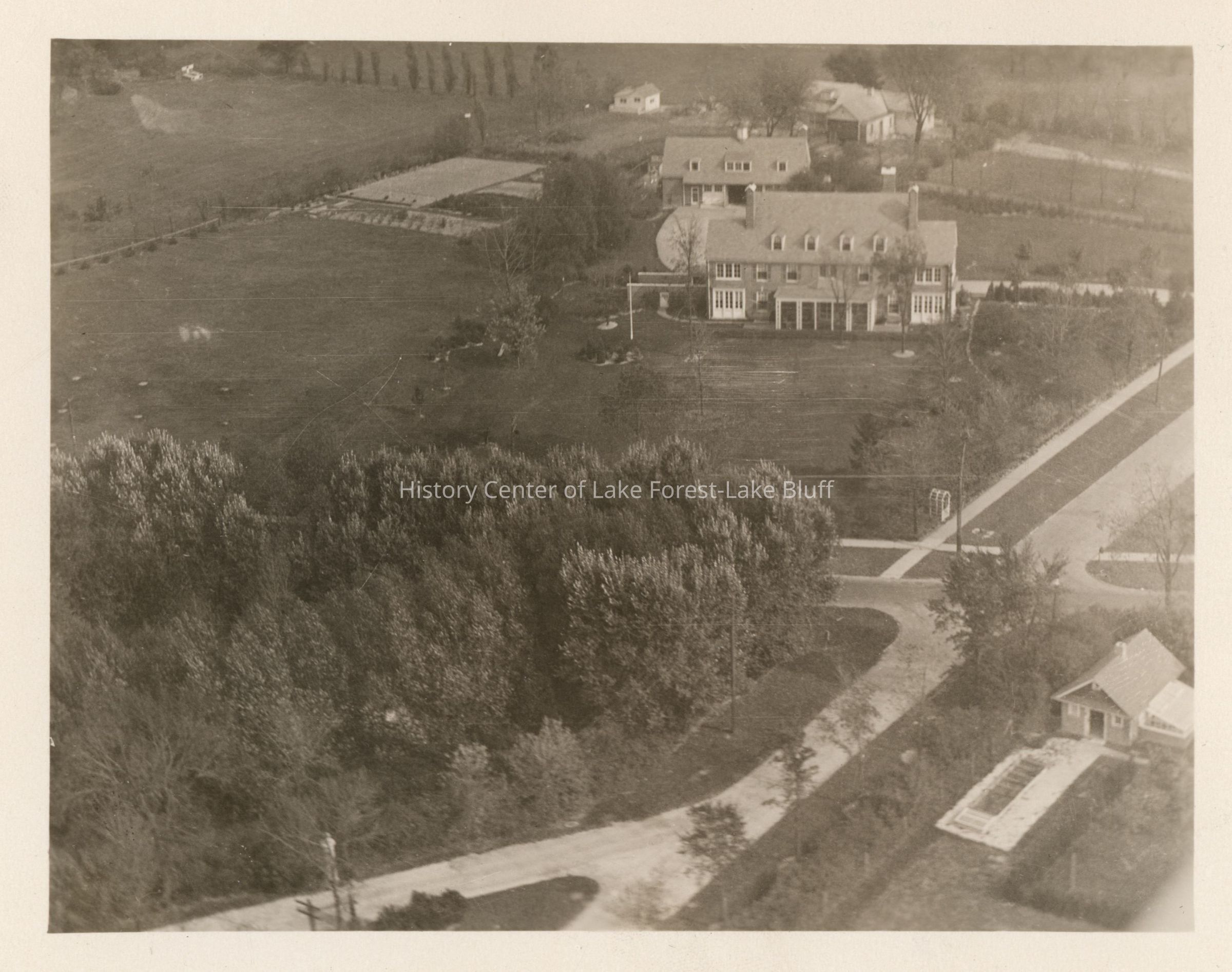 Aerial view, looking east, of 6 East Laurel Avenue, at the northeast corner of Laurel and Green Bay Road. Alfred T. and Mildred Wells Carton estate - undated but after 1918, probably c. early 1920s. Main house, garage and gardens in view. Built in 1917-1918 - architect Chester H. Walcott, landscape architect James Roy West, with O.C. Simonds Landscape Design