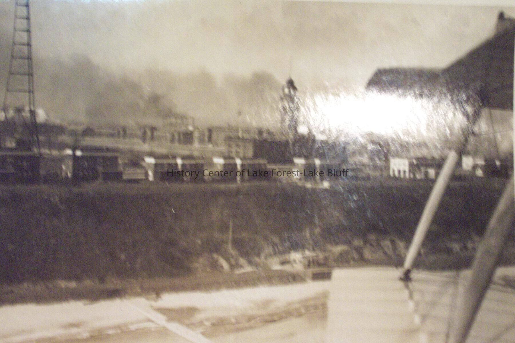 aerial view of Great Lakes Naval Center lots of smoke from heat plants. 2 large towers and open space in foreground. see also 2002.22.79