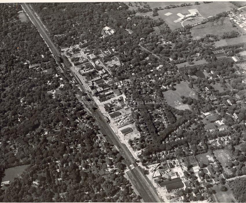 Aerial view of Lake Forest Business District Prior to Oct 1960 since C&NW platform shed roofs have not been cut back for additional parking