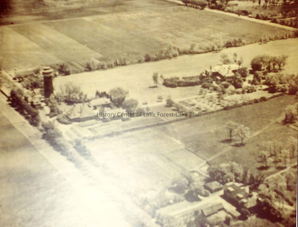 aerial view of Westmoreland built by A.B. Dick in 1902 by architect James G. Rogers at 537-549 King Muir Road as a forty-acre summer estate near Deerpath and Waukegan Road. The name "Westmoreland" was taken from Westmoreland County, Pennsylvania where Mr. Dick had spent some time. The main house designed by Rogers was constructed of brick and stone and built in the French Renaissance style, had twenty rooms, sleeping porches (added around 1910) The house was razed in 1948. In 1939, Albert Dick's widow Mary gave 24 acres of the farm as a site for the new hospital to replace Alice Home Hospital on the Lake Forest College campus. She also left an additional 60 acres in her will in 1944, which included the manor house, garage, barn and several cottages of the original estate. Stanley Anderson, who built Lake Forest Hospital copied the manor house for the original hospital building.