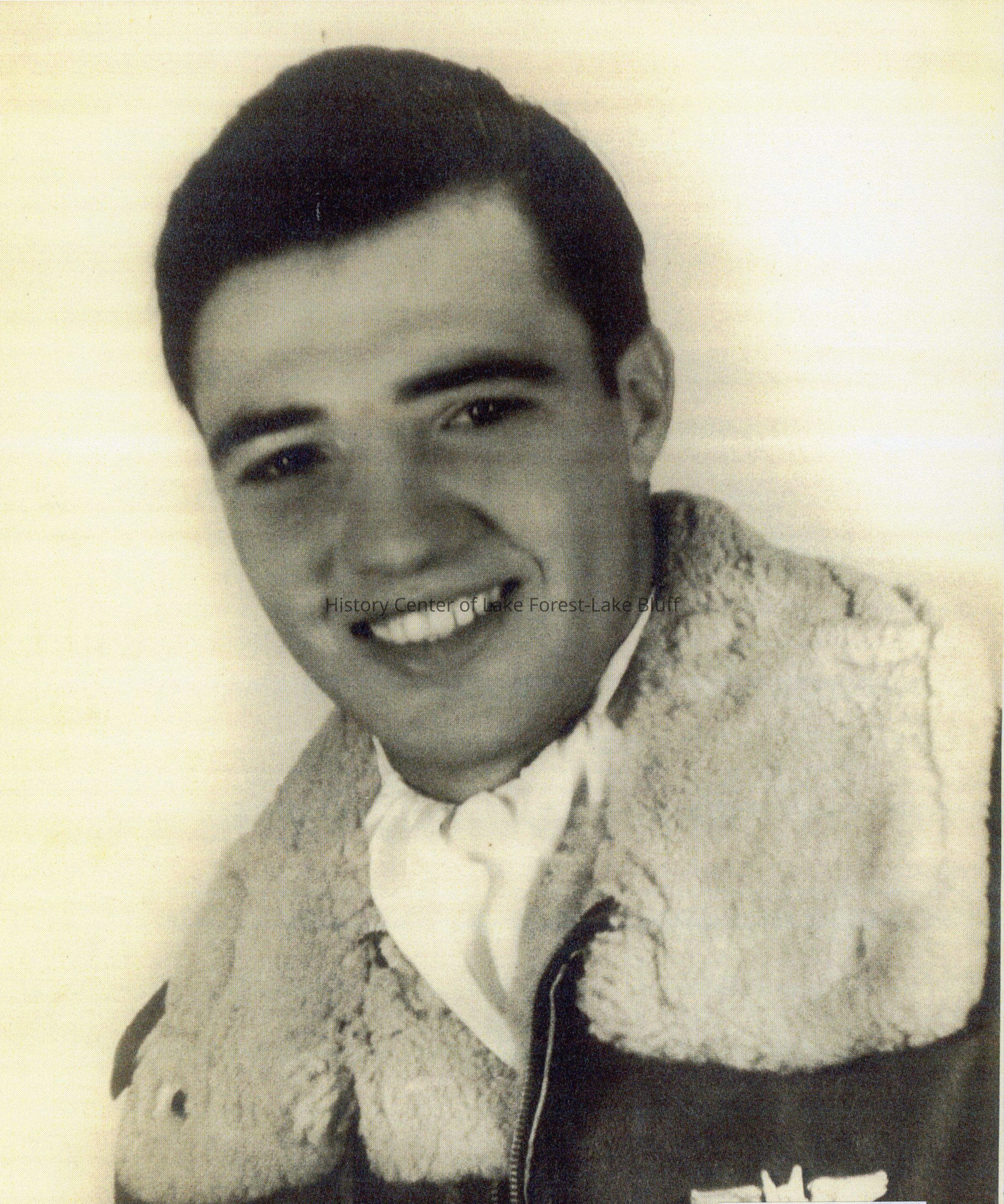 The image shows a young man smiling, wearing a fur-collared jacket.