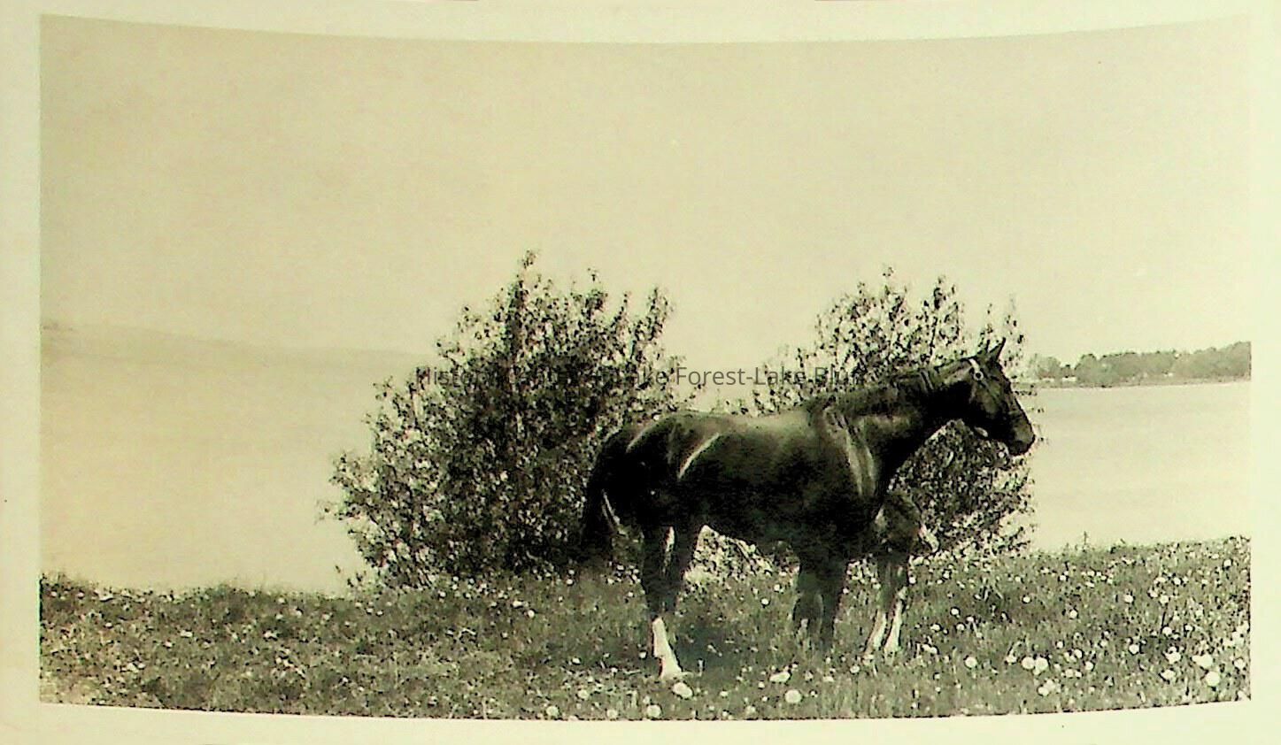 Photograph of a mare, possibly named "Chlorinda" Back reads "A well bred ,are & foal, this mare has as good blood lines as any of that, shes not anything to look at, but (illegible) fine foals" Undated.