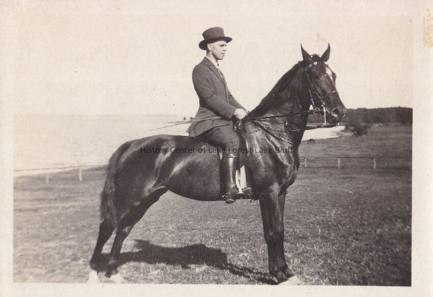 Photograph of a man on a horse. Back reads "Fosie Tate, a 3 year old mare & gifted, taken in one of our paddock near the lake.