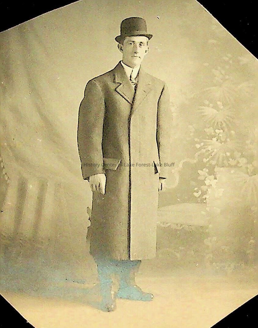 Small cutout of a postcard photograph. The man in the photo is identified as being James "Jim" Dinley, the husband of Jean Dow Dinley. Photo was cut on each corner.